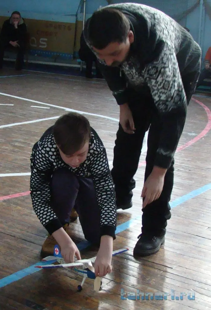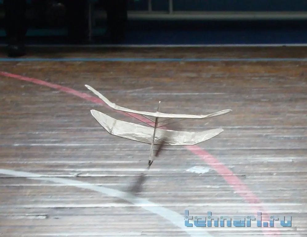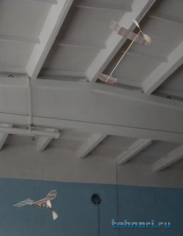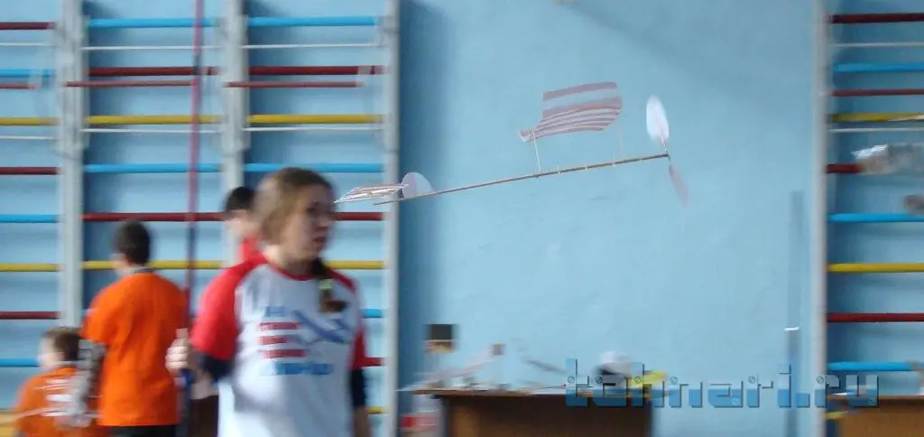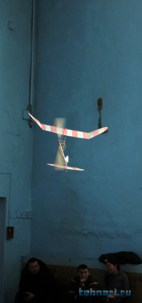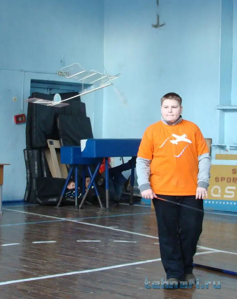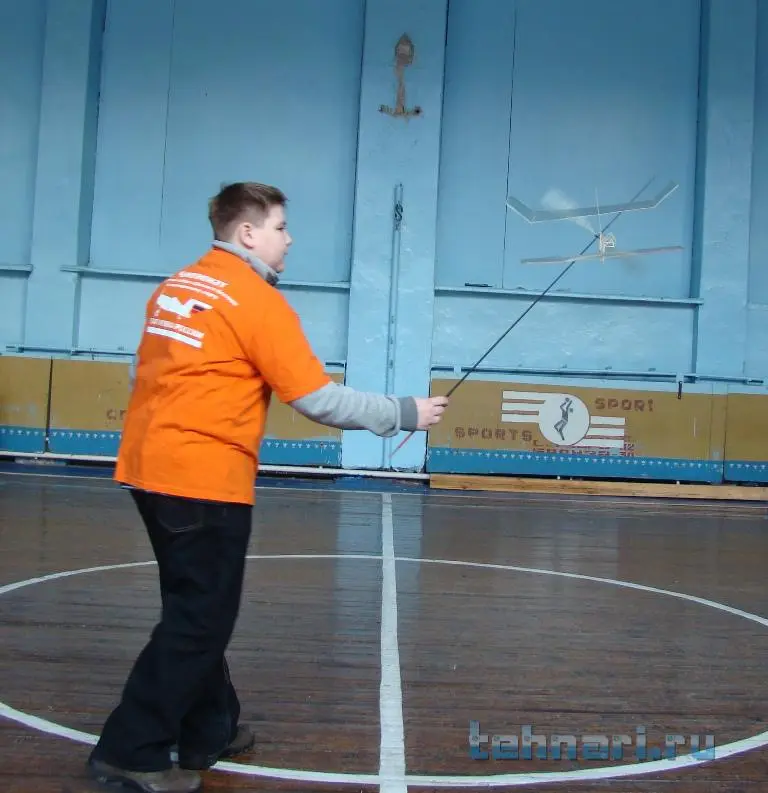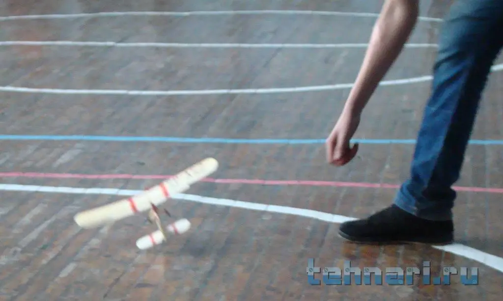 Настройка управляющих поверхностей (стабилизатора и руля направления) позволяет совершать модели полет по кругу с постепенным подъемом к потолку спортзала и обратным спуском.