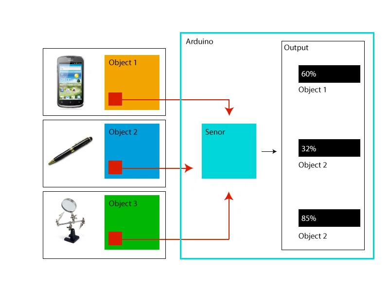 Я отбираю объекты не случайно, а таким образом, чтобы они могли быть "прочитаны" сенсором. Ну например - объекты с разным магнитным полем?! В наборе будет , например 4 объекта, которые имеют разную силу магнитного поля. Ардуино будет выдавать информацию, основываясь на соответствиях: магнитное поле = инфа на дисплей