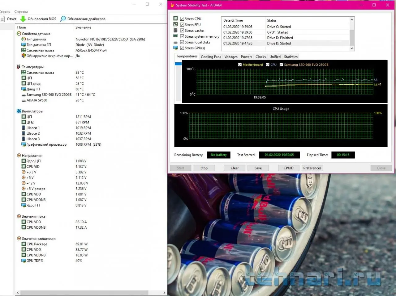 15 минут, работает, радиатор на vrm по пальцометру как трубки видеокарты(если верить аиде 60 градусов)