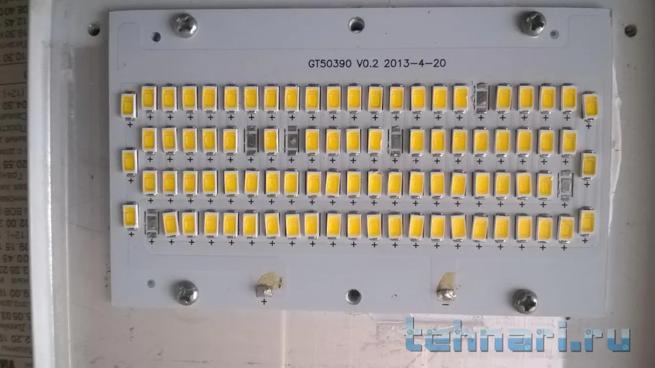 По поводу прожектора с фото, там помимо сгоревших светодиодов некоторые похоже тоже на подходе, советую после замены, на небольшое время подать повышенный ток, замкнуть несколько исправных светодиодов чтоб ток остальной цепи увеличился, таким образом сгорят слабые и не придётся ещё несколько раз лазить в светильник чтоб их поменять.