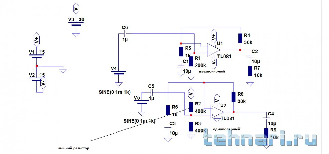 Большая амплитуда, это актуально для усилителя мощности, но не очень это и большую проблему создает. А какая нестабильность возле нуля? Наоборот, с однополярным питанием проще, а эффект тот же самый, кроме того, если двухполярный БП , у него надо 2 идентичных БП, больше пульсаций к одного или у одного больше напряжение, это выльется в фон. А делитель дает среднюю точку, более точнее выходит.