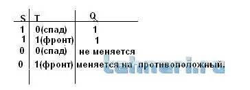 1 и 0 на входе Т, это значит, был 0 стала еденица, и была 1 стал 0 и переключение происходит в момент перехода.