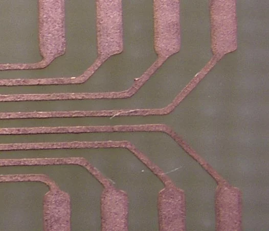На краях проводников отчетливо видно подтравливание. На одном даже висит волосок.
