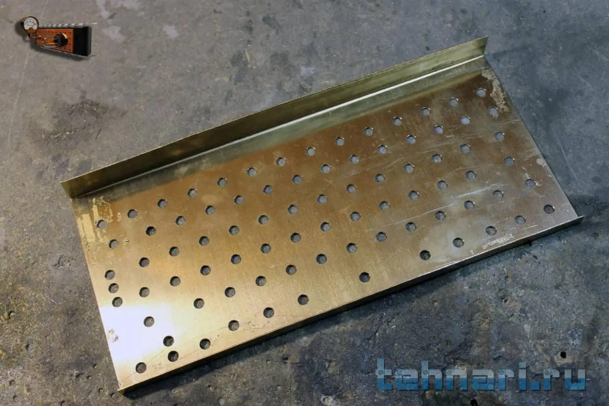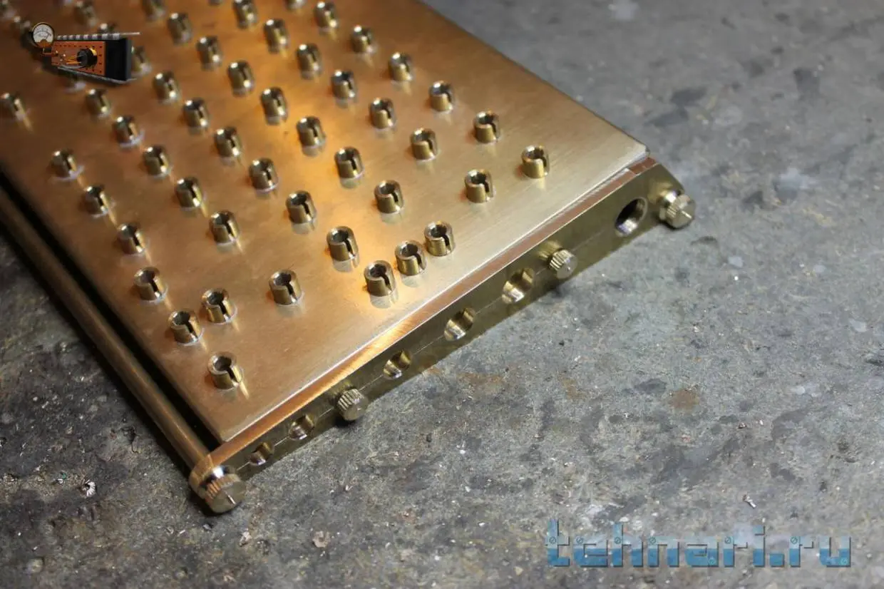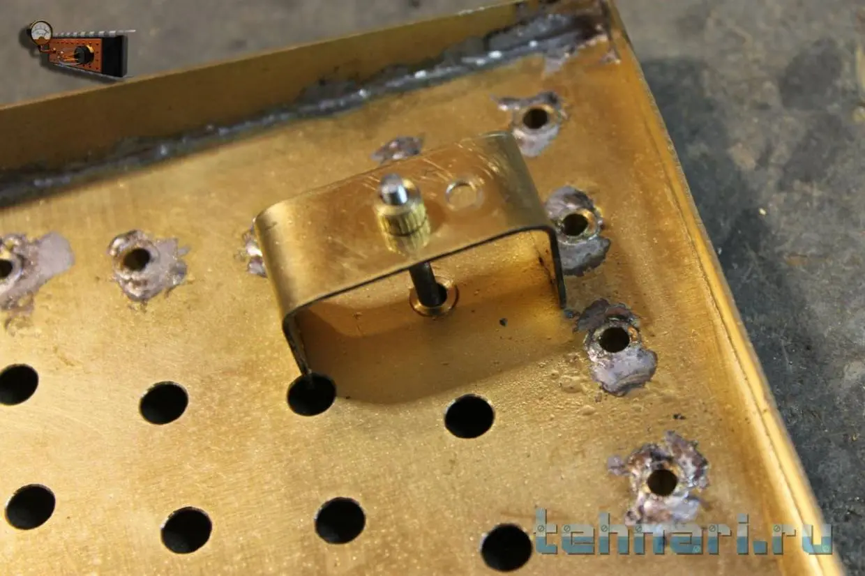 Для этого из листа миллиметровой латуни сгибаю П-образный профиль, тщательно размечаю и сверлю в нём отверстия под кнопки.