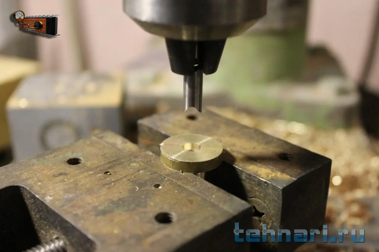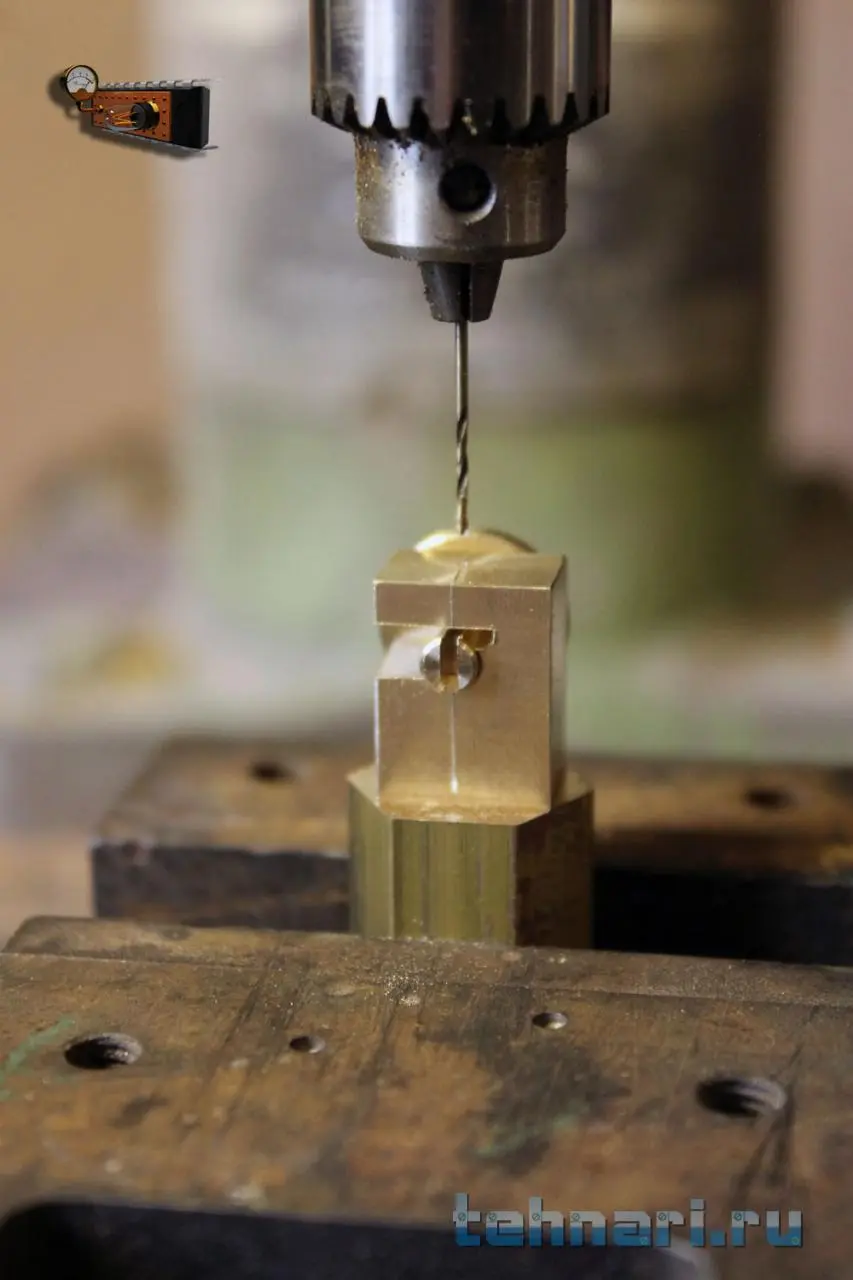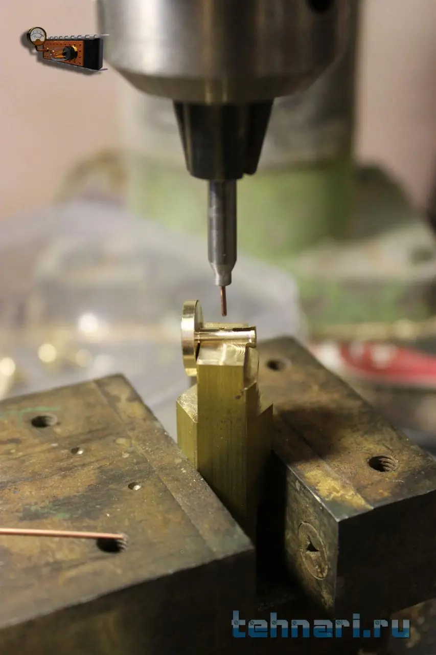 Но это ещё не всё, надо сделать так, чтобы кнопка не вращалась во втулке. Для этого по кондуктору сверлю отверстие диаметром 0.95 мм.