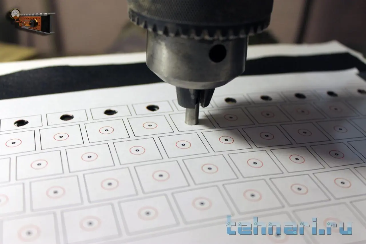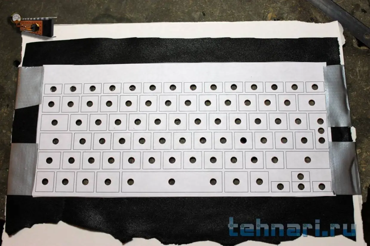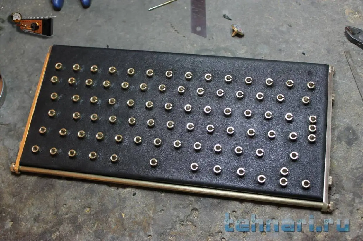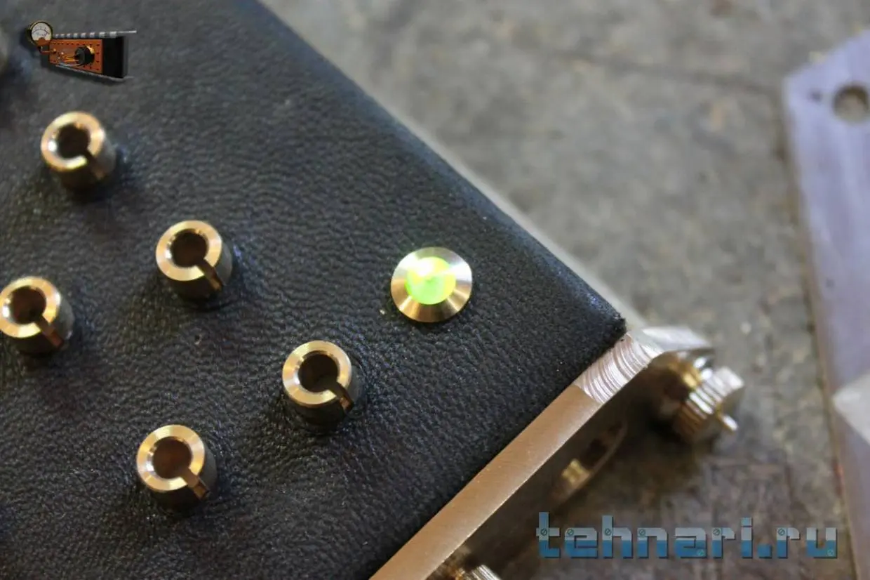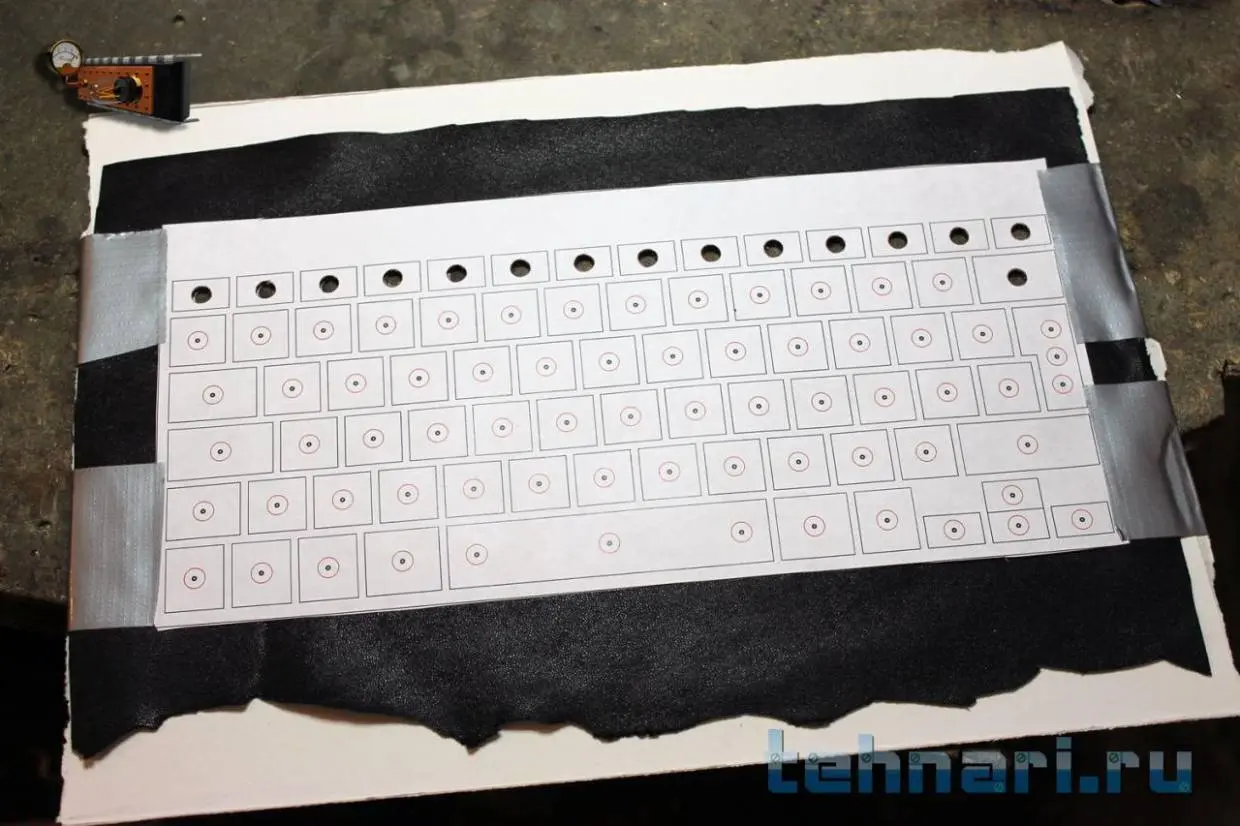 Сначала думал сделать фон кнопок из дерева, но потом решил, что кожа будет лучше. Тем более я недавно порвал свою кожаную куртку так, что зашить не получится. Но есть проблема в точном вырезании отверстий в коже. После некоторых раздумий было найдено простое решение – канцелярский дырокол!