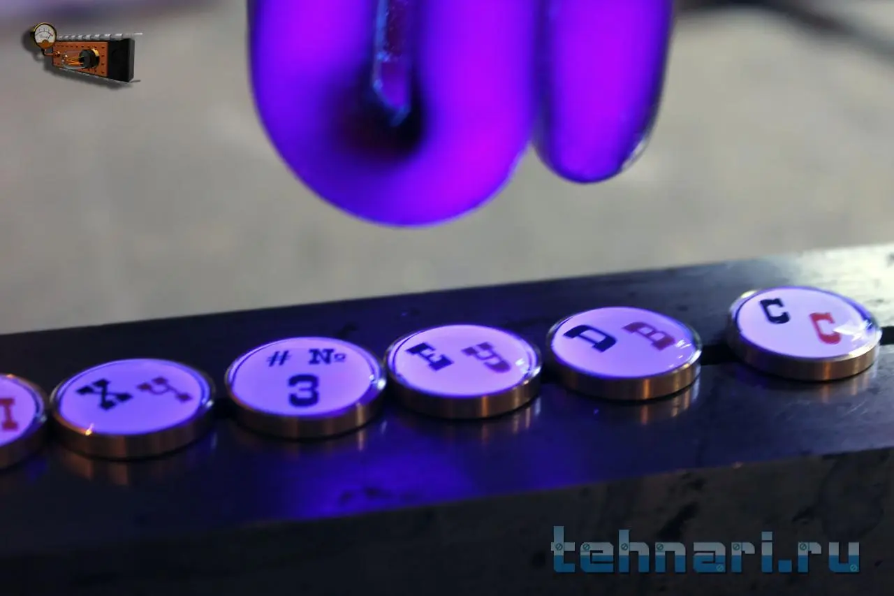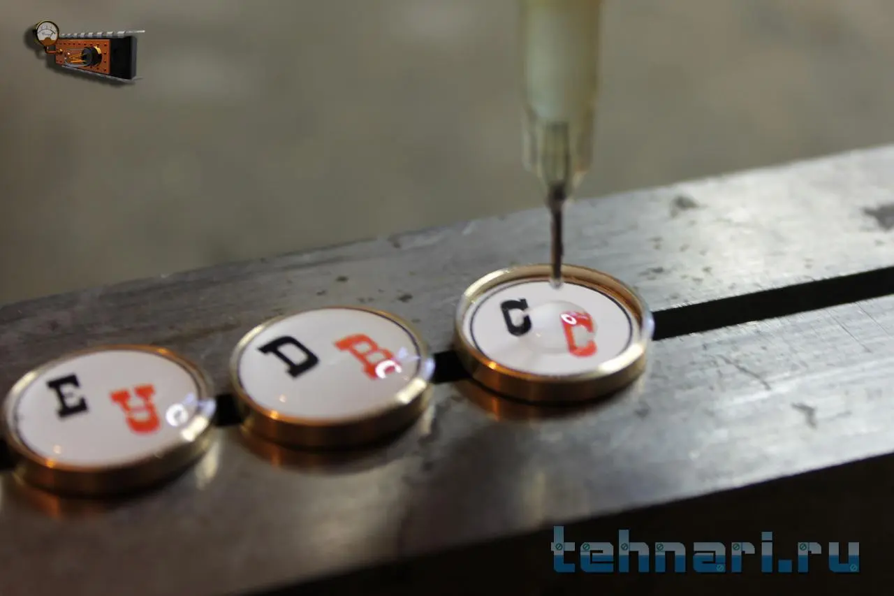 Плёнка вклеивается на дно углубления в торце кнопки. Для придания кнопке долговечности заливаю изображение акрилом, который твердеет от ультрафиолета.