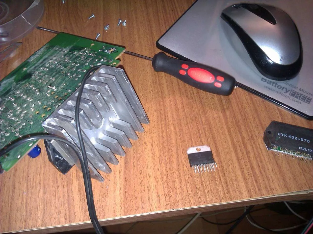 Удалив пробитый транзистор и припаяв к точкам его подключения короткие провода к КТ819Г и закрепив его рядом на радиаторе, удалось восстановить работоспособность УНЧ.