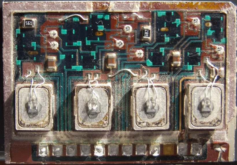 Никакого компаунда. Вот фото одной из них, правда не УНЧ, а стабилизатора, но устройство одинаковоемикросборка залита каким-то компаундом