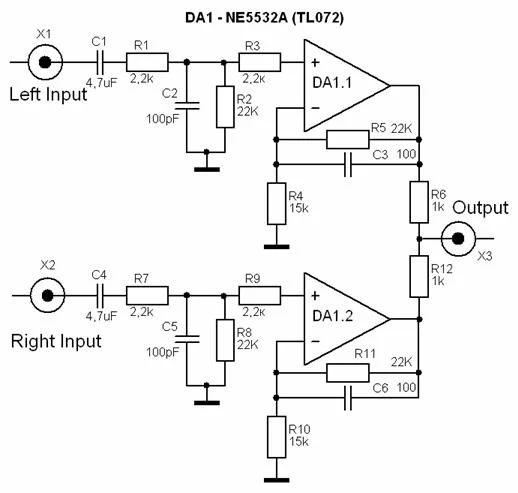 Здравствуйте. Есть колонка с моно усилителем, планируется подключение cd/mp3 плеера, соответственно необходим сумматор, чтобы собрать стерео в один канал. Нашел несколько схем, используются в сабвуферах. Какие окажут минимальное воздействие на качество звука.