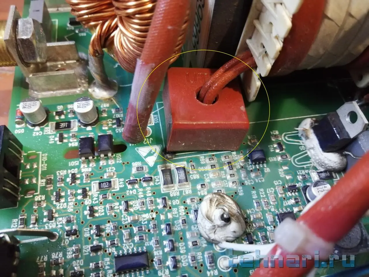Вскрыл и обнаружил на плате потемнения. Не знаю что это за деталь(вероятно трансформатор тока) на детали написано UTK, она имеет два вывода. Один вывод оторван из-за чего появилось потемнение на плате.