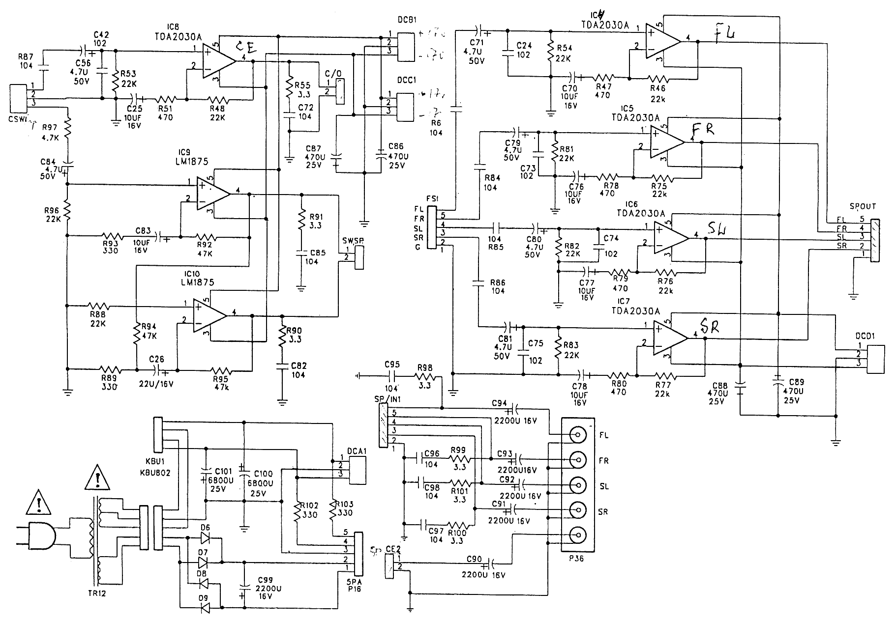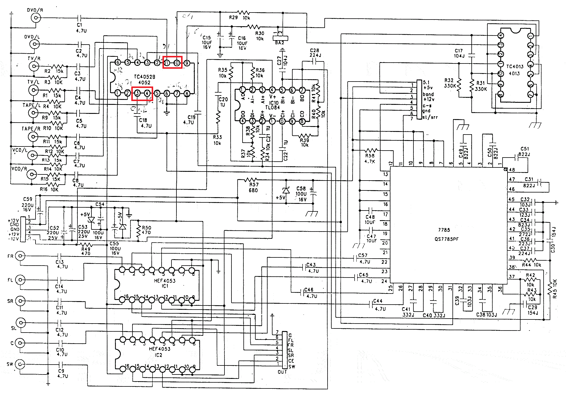 Доброго времени суток форумчане. Читал интересную тему по поводу ремонта акустики Sven IHOO-5.1. Нашёл много информации полезной. Но обращаюсь к вам с такой проблемой. При подключении внешнего источника на вход CD/VCD Играет только сабвуфер, сателлиты молчат. При по подключении на DVD, все молчит, НО при замыкании ножек на микросхеме TC4052B как я показал на схеме, начинает играть сабвуфер и очень тихо сателлиты. Да, и ещё не горят светодиоды на передней панели. Прошу помощи!