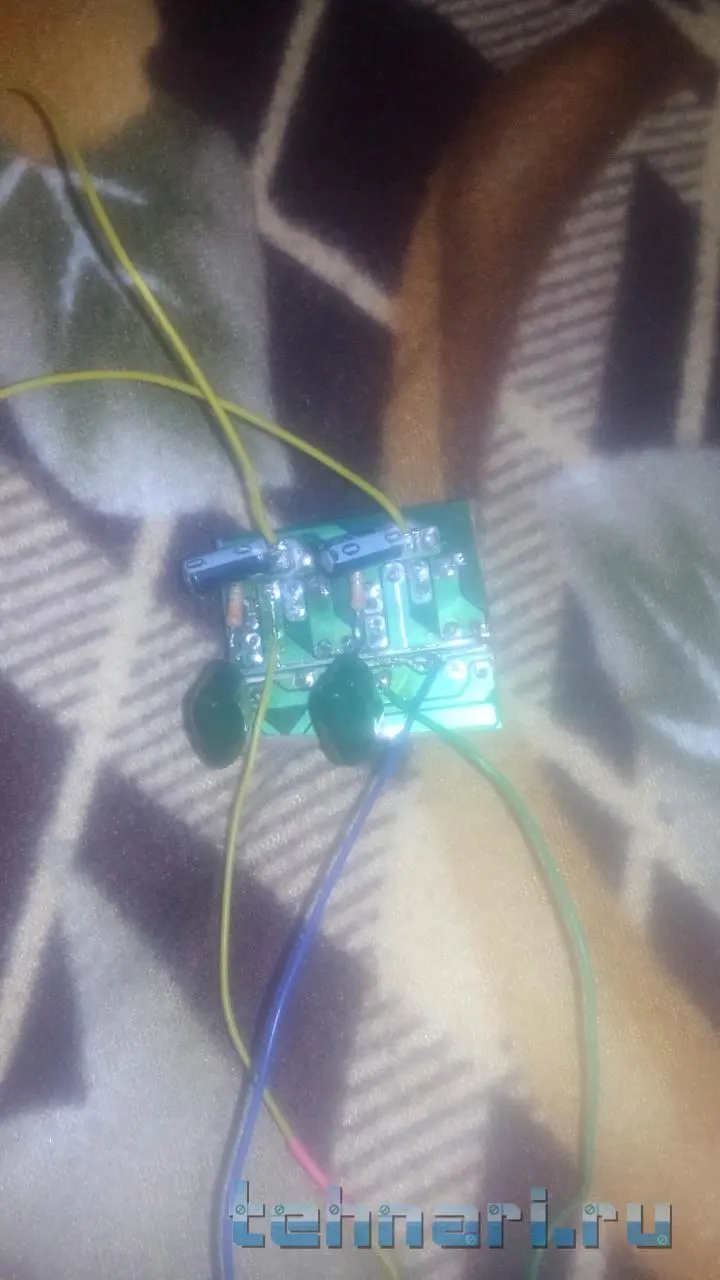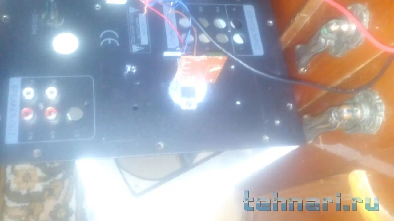 На выходах стерео сразу к плате подпаял конденсаторы на десяток микрофарад - чтобы на пищалки не проскакивали низкие частоты. Вход для НЧ-канала решил снять с каждого канала сразу по входу после темброблока через резисторы 1кОм на канал - чтобы была возможность поступления сигнала сразу с обоих каналов.