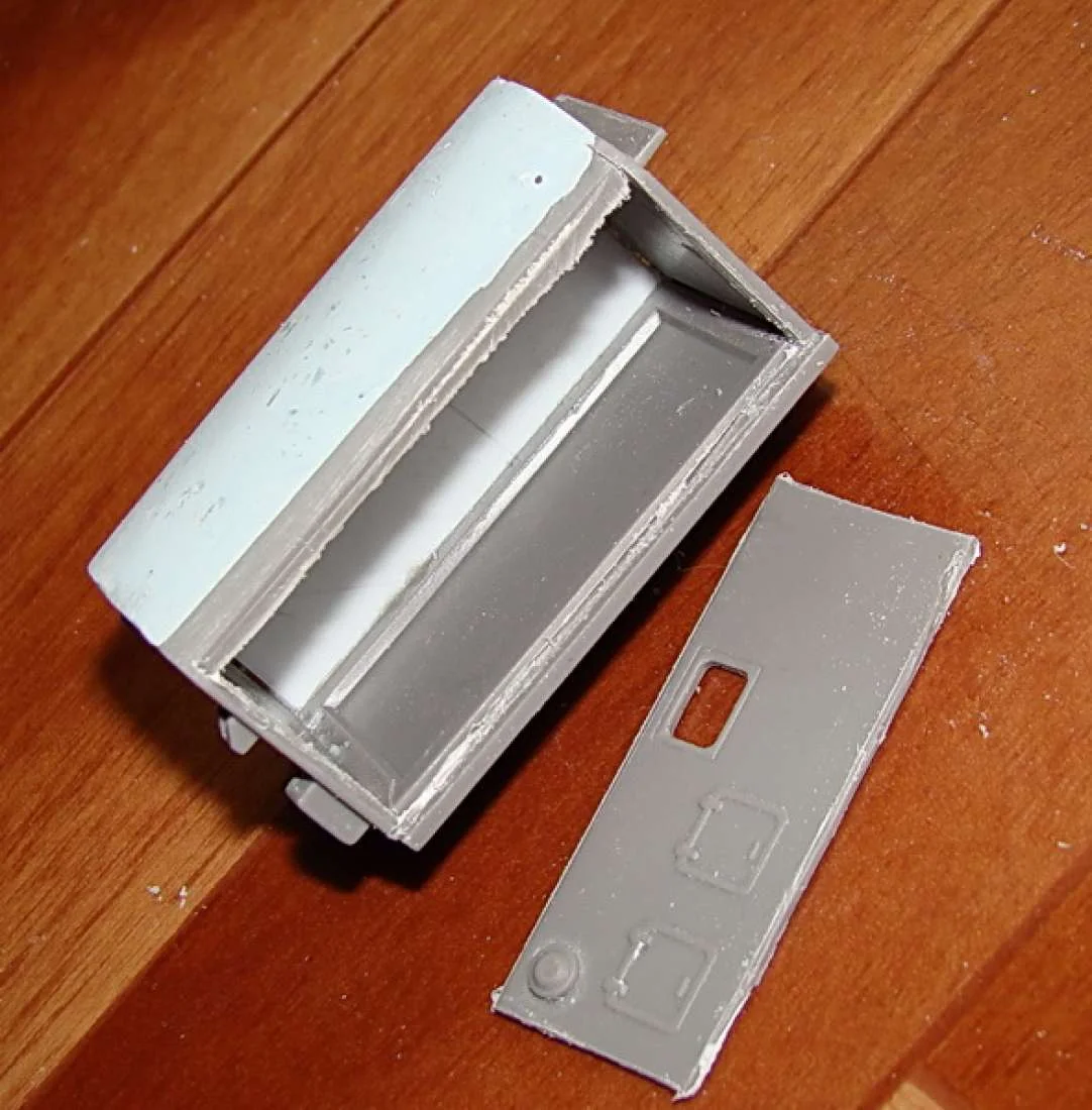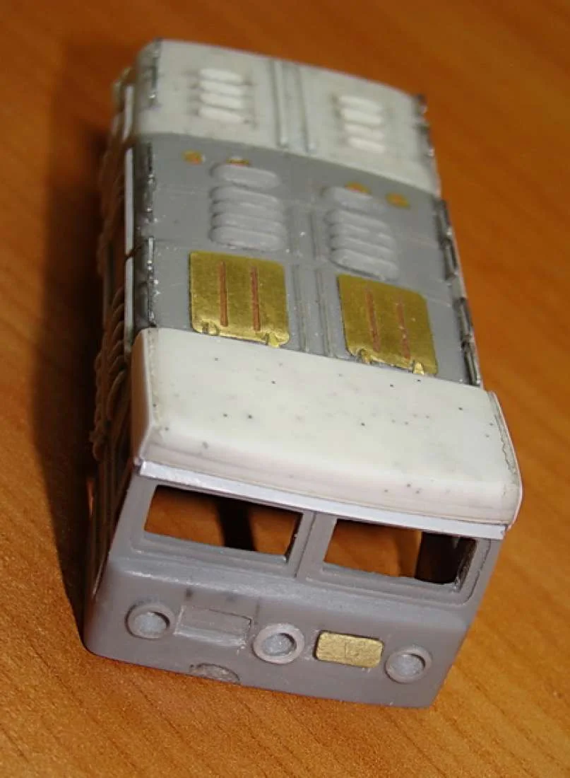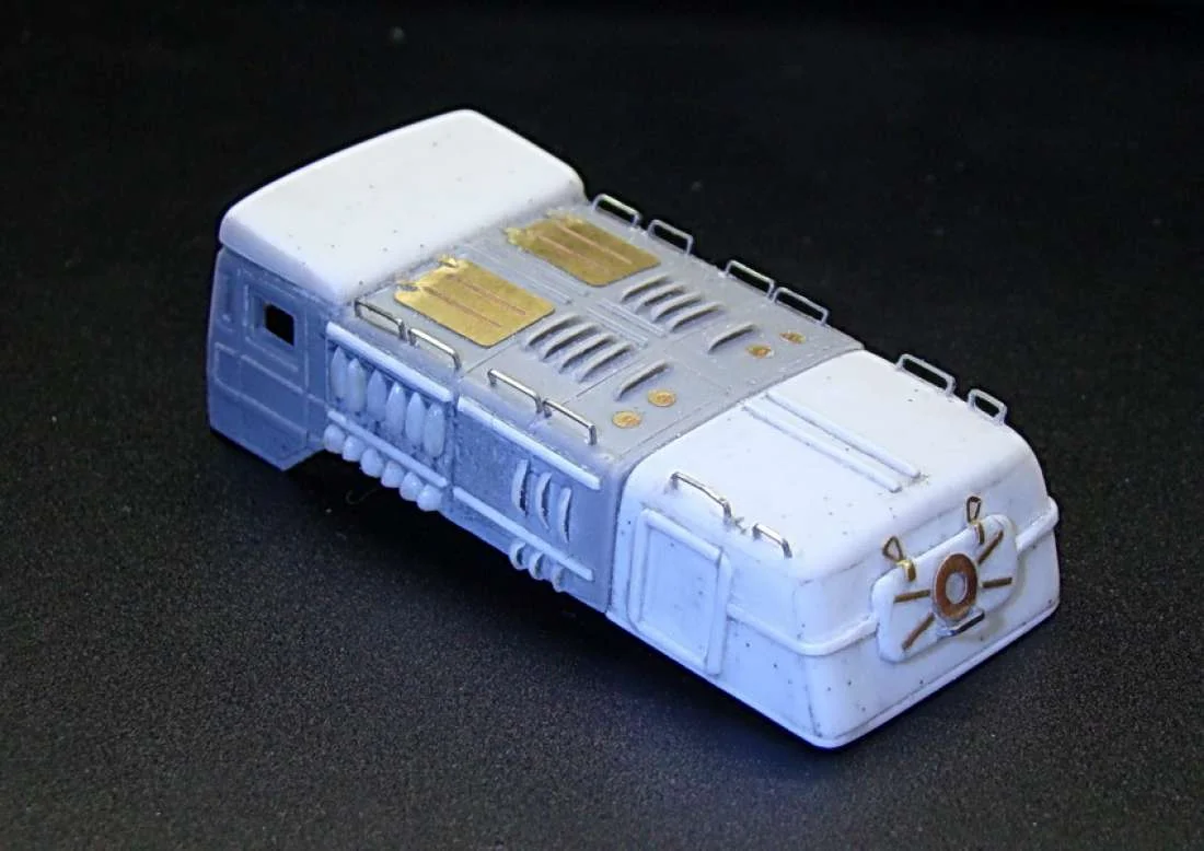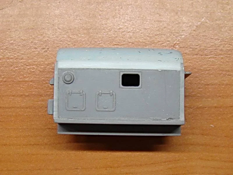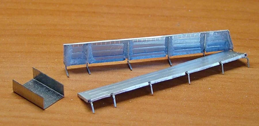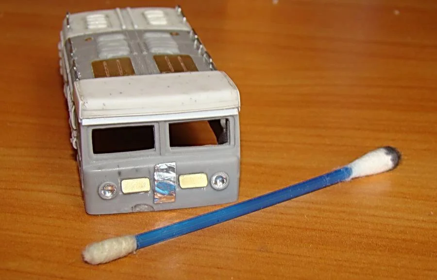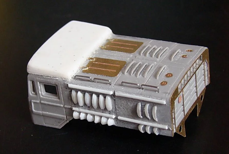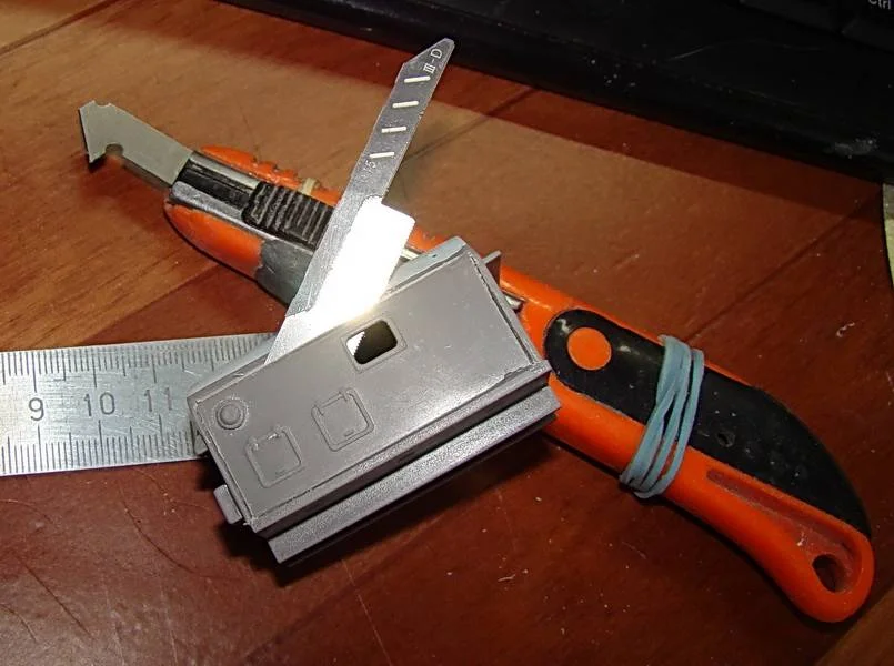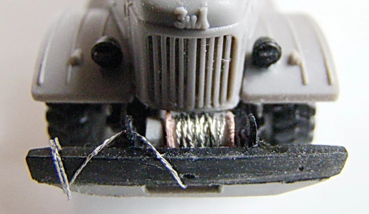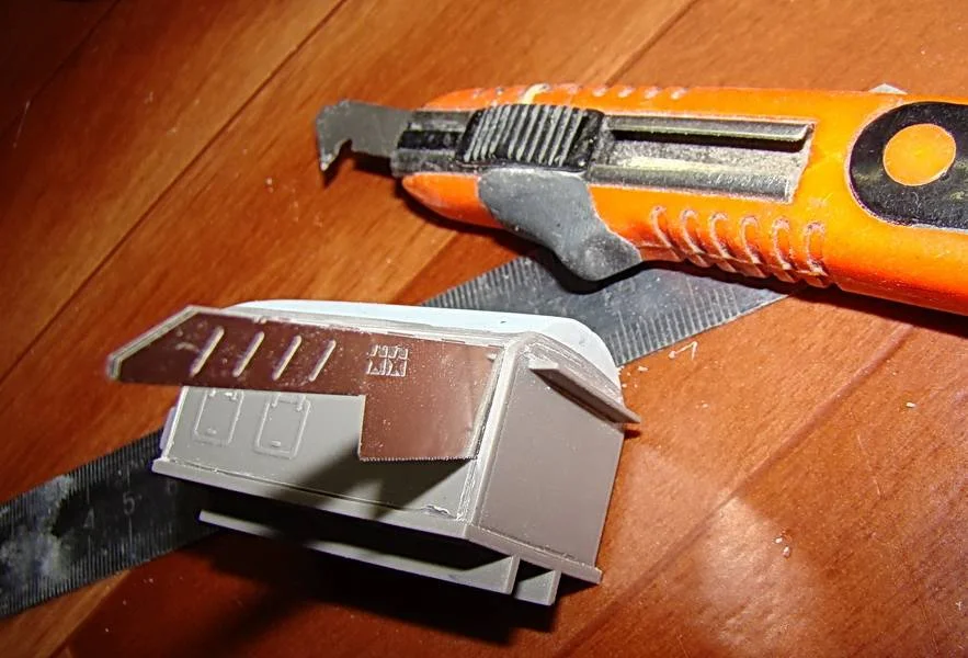 Для изготовления выштамповок воздухозаборной решетки моторного отсека использовал бобышки от полистироловой тары для продуктов.Вырезав бобышку из основания , прошкуриваю ее торец на шкурнике, а затем аккуратно ножом разрезаю ее вдоль осевой линии на две части. Линейные выштамповки на кожухе изготовил из листового полистирола, нарезав тонкие полоски, которые после приклейки немного прошкурил, для придания нужной высоты и конфигурации. А затем вклеил на штатные места выштамповки воздухозаборников. Скобы-поручни изготовил из скобок для степлера и установил на штатные места в предварительно просверленные отверстия, закрепив их клеем.