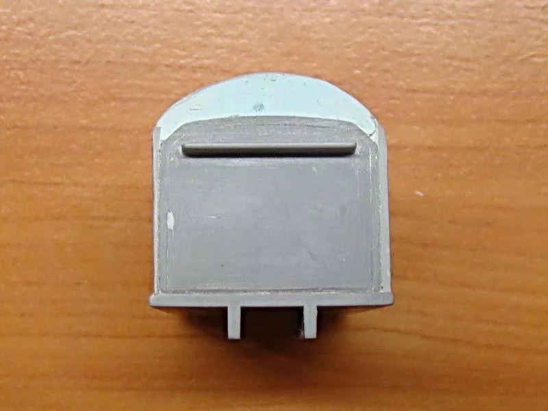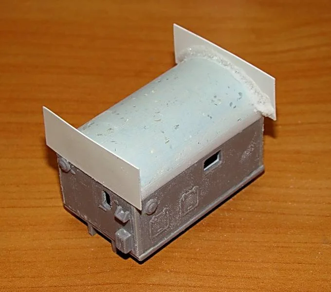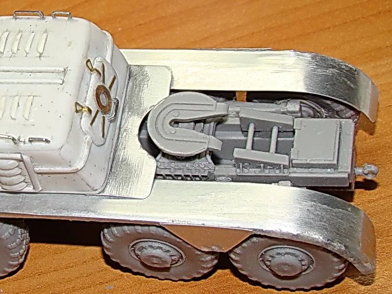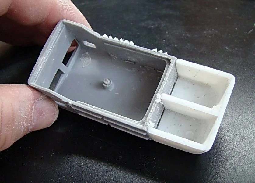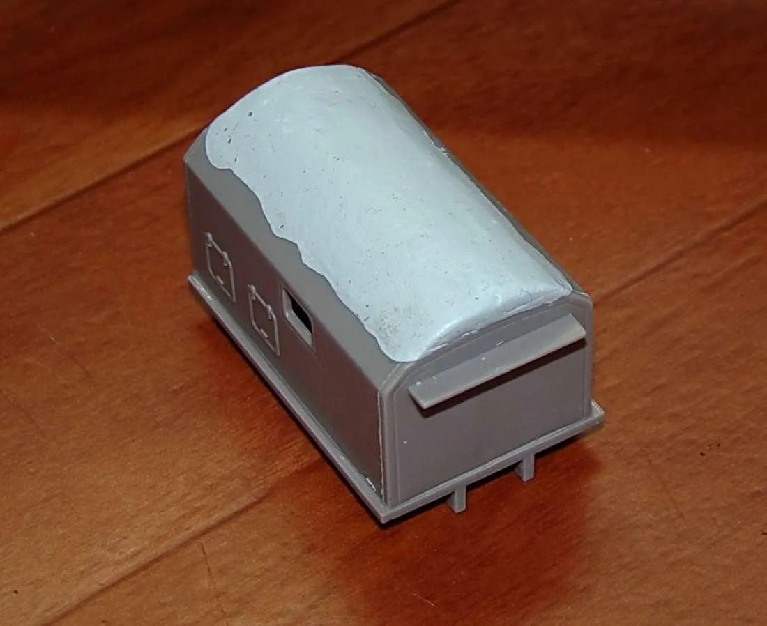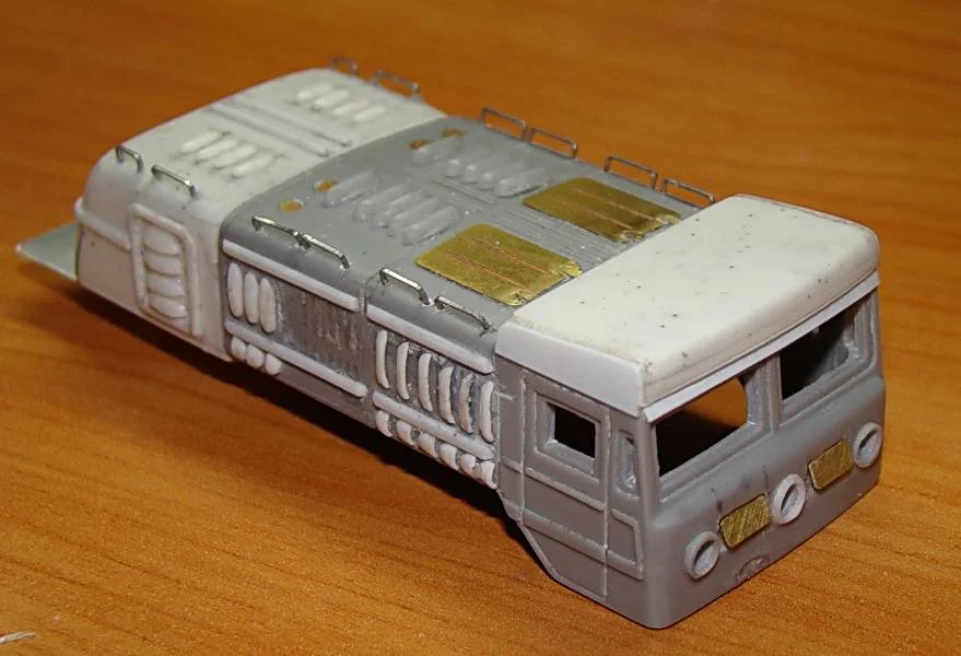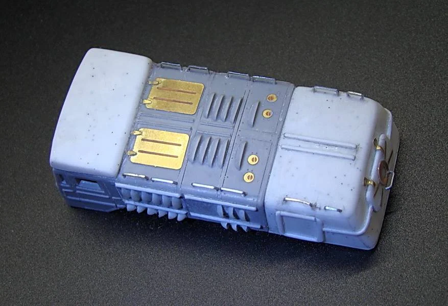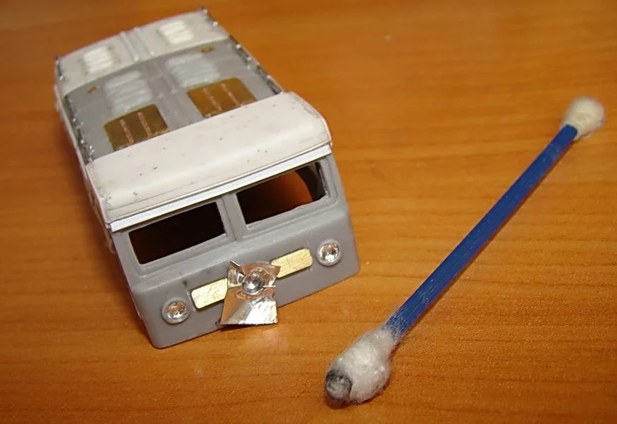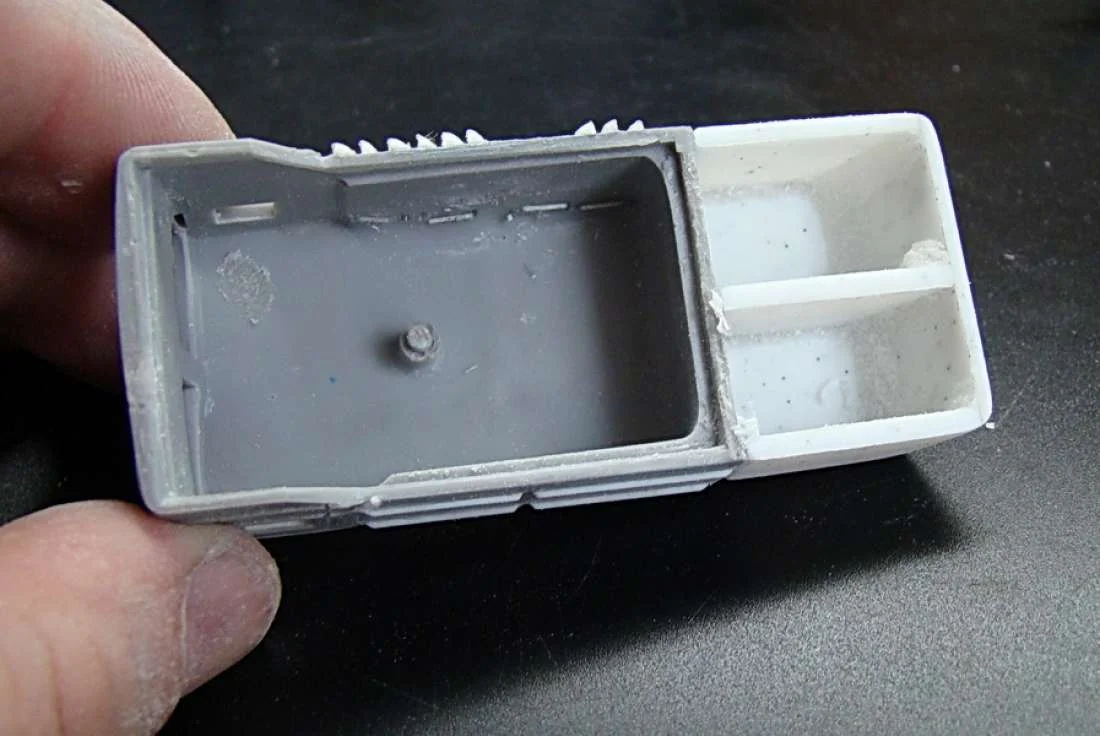 Для изготовления выштамповок воздухозаборной решетки моторного отсека использовал бобышки от полистироловой тары для продуктов.Вырезав бобышку из основания , прошкуриваю ее торец на шкурнике, а затем аккуратно ножом разрезаю ее вдоль осевой линии на две части. Линейные выштамповки на кожухе изготовил из листового полистирола, нарезав тонкие полоски, которые после приклейки немного прошкурил, для придания нужной высоты и конфигурации. А затем вклеил на штатные места выштамповки воздухозаборников. Скобы-поручни изготовил из скобок для степлера и установил на штатные места в предварительно просверленные отверстия, закрепив их клеем.