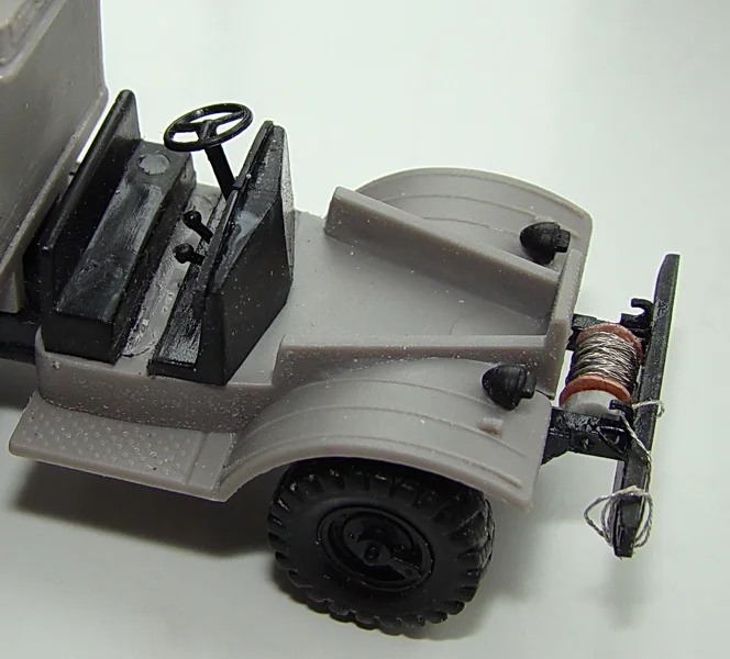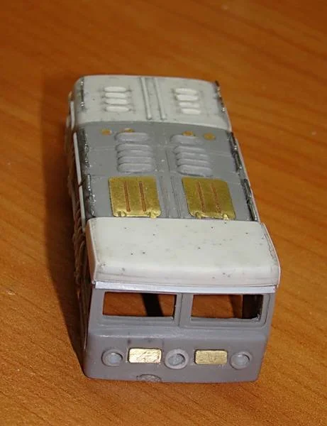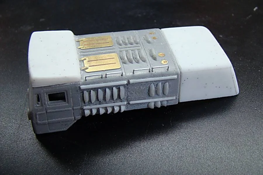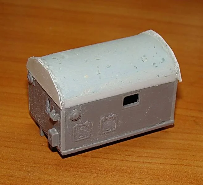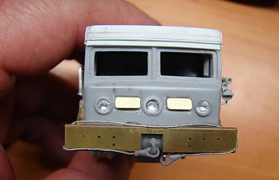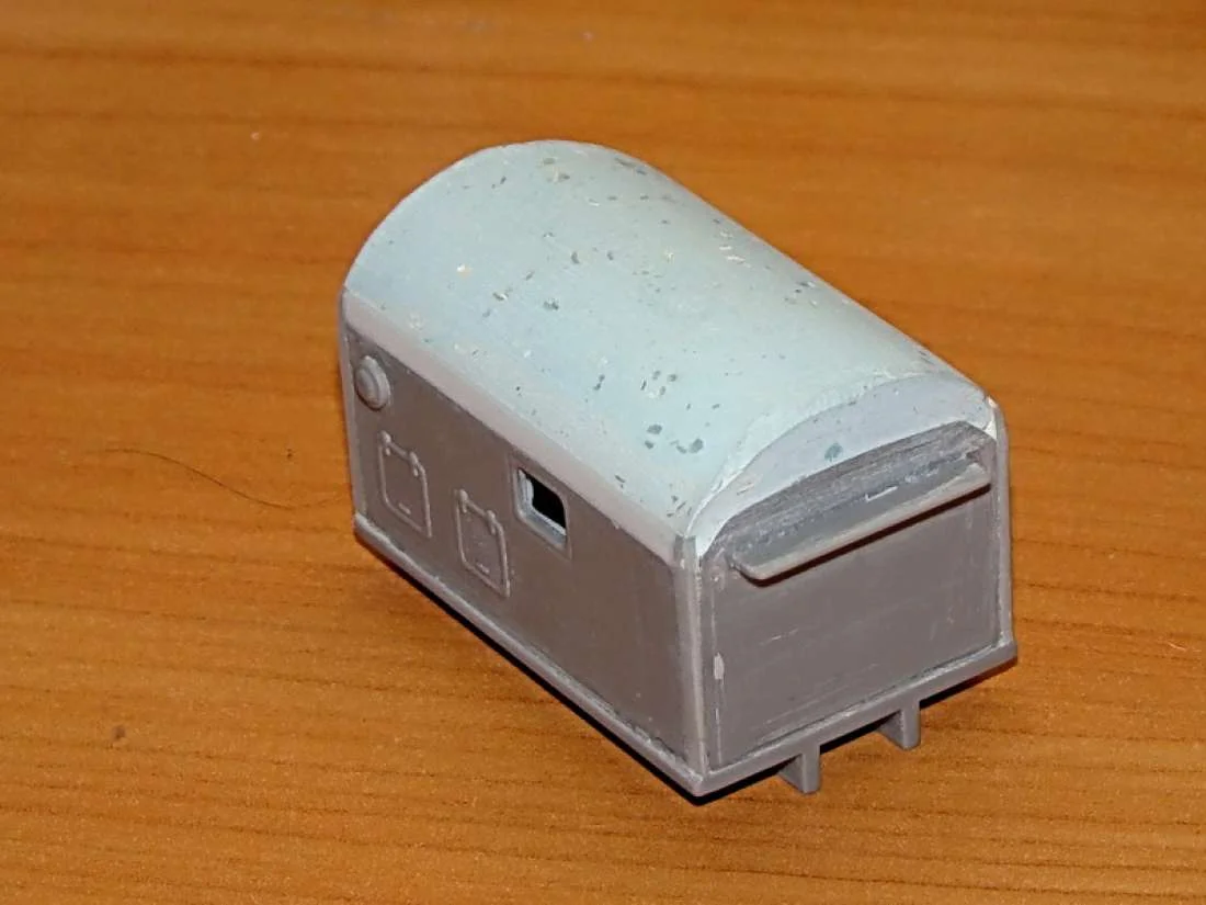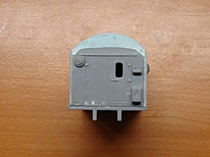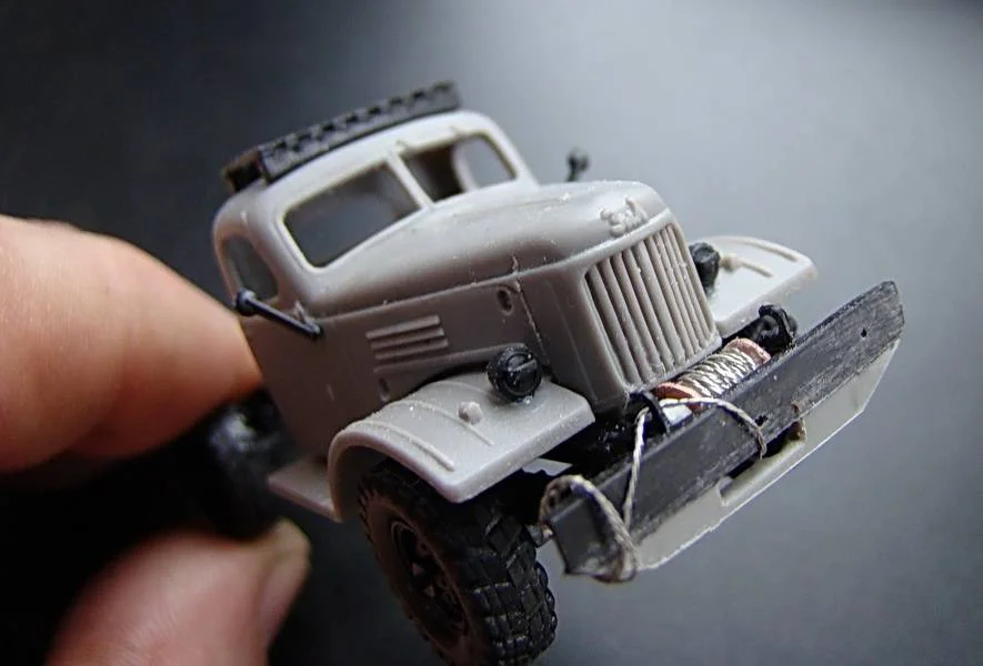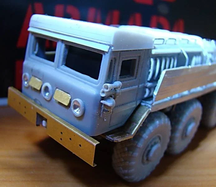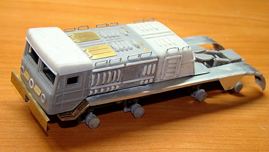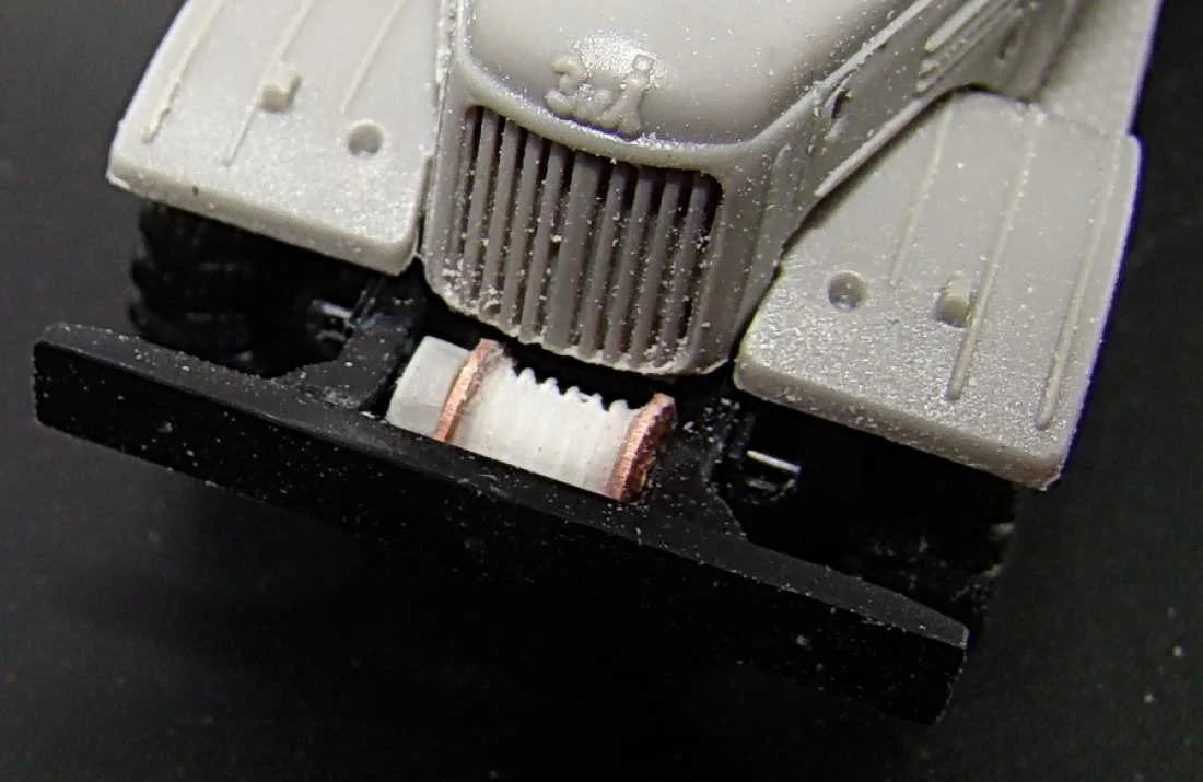 Для изготовления выштамповок воздухозаборной решетки моторного отсека использовал бобышки от полистироловой тары для продуктов.Вырезав бобышку из основания , прошкуриваю ее торец на шкурнике, а затем аккуратно ножом разрезаю ее вдоль осевой линии на две части. Линейные выштамповки на кожухе изготовил из листового полистирола, нарезав тонкие полоски, которые после приклейки немного прошкурил, для придания нужной высоты и конфигурации. А затем вклеил на штатные места выштамповки воздухозаборников. Скобы-поручни изготовил из скобок для степлера и установил на штатные места в предварительно просверленные отверстия, закрепив их клеем.