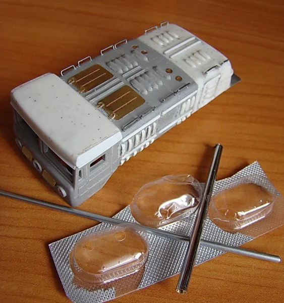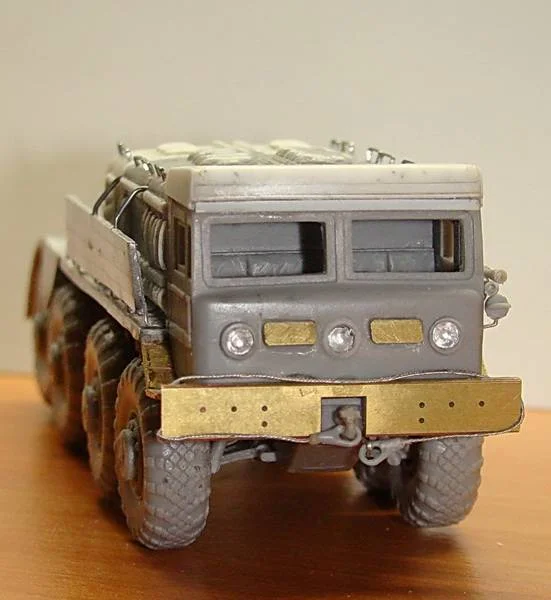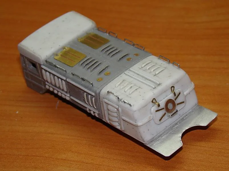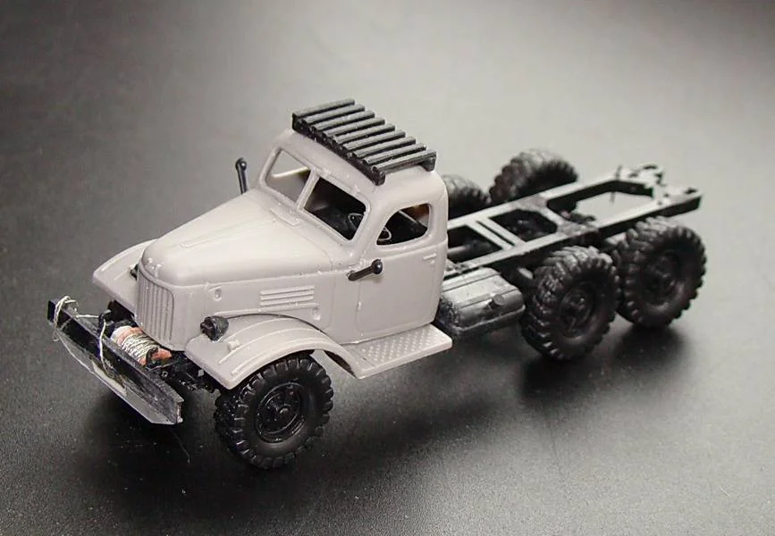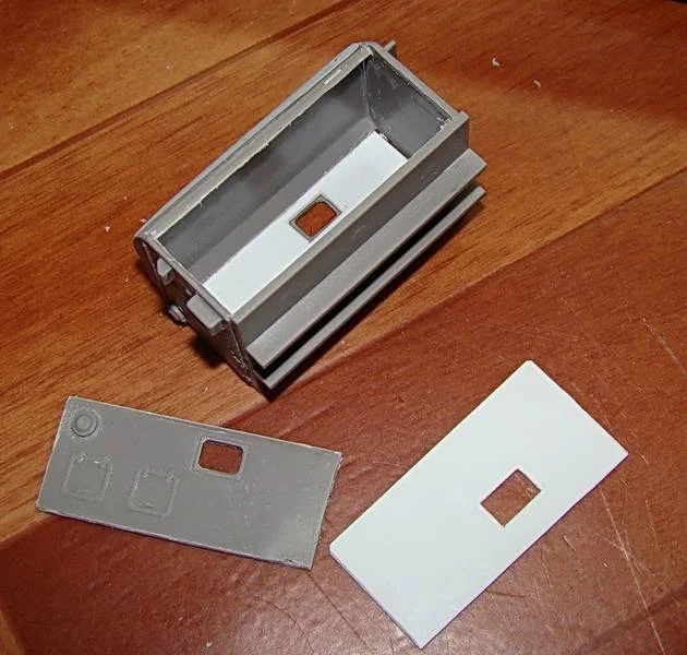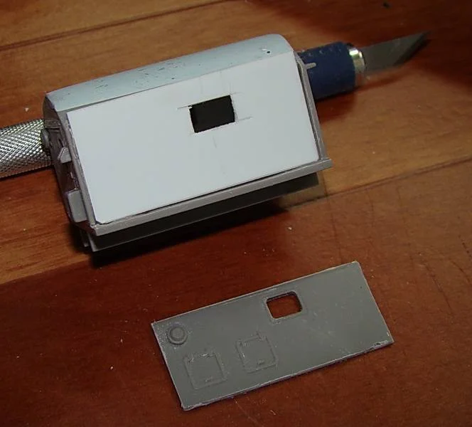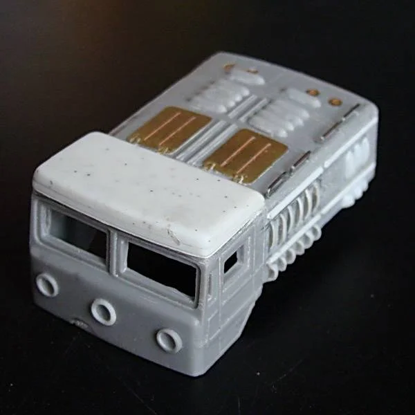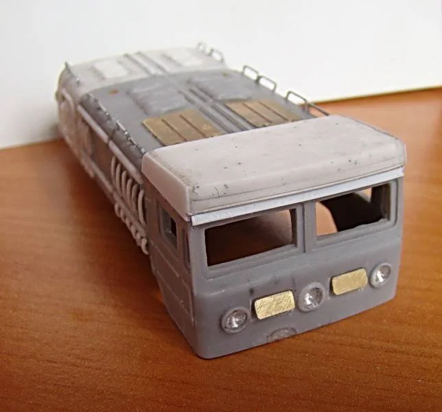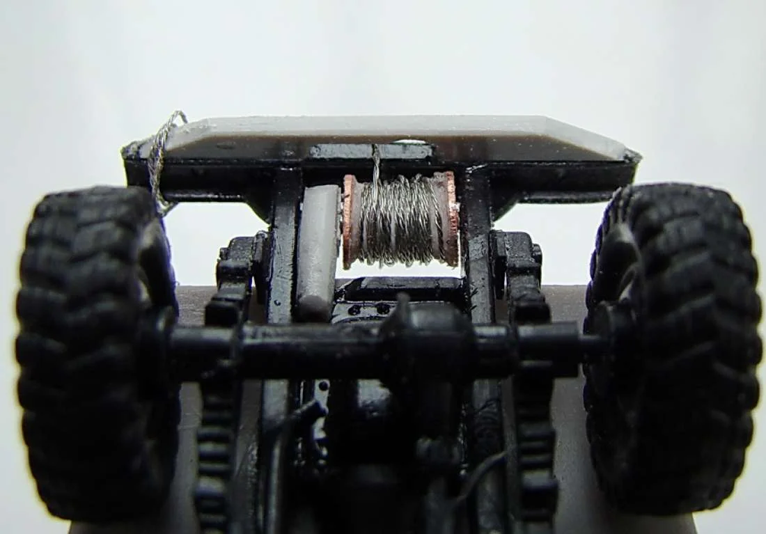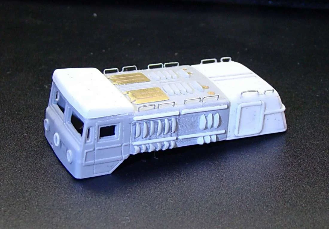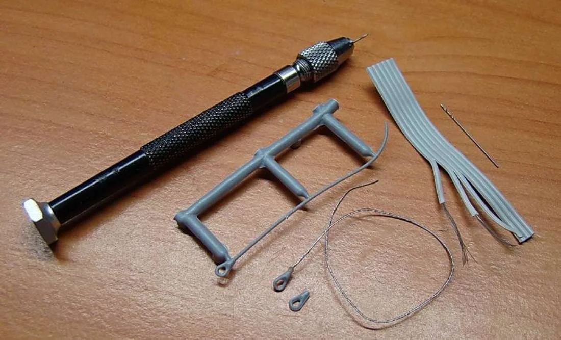 Для изготовления выштамповок воздухозаборной решетки моторного отсека использовал бобышки от полистироловой тары для продуктов.Вырезав бобышку из основания , прошкуриваю ее торец на шкурнике, а затем аккуратно ножом разрезаю ее вдоль осевой линии на две части. Линейные выштамповки на кожухе изготовил из листового полистирола, нарезав тонкие полоски, которые после приклейки немного прошкурил, для придания нужной высоты и конфигурации. А затем вклеил на штатные места выштамповки воздухозаборников. Скобы-поручни изготовил из скобок для степлера и установил на штатные места в предварительно просверленные отверстия, закрепив их клеем.
