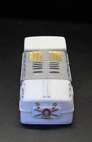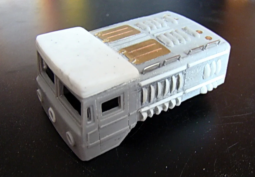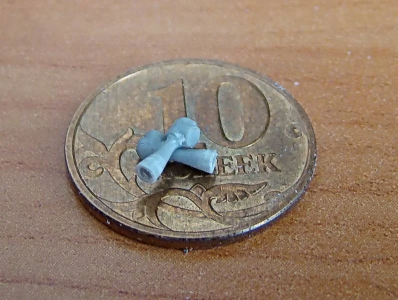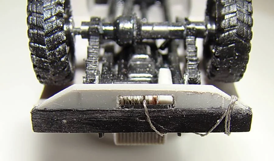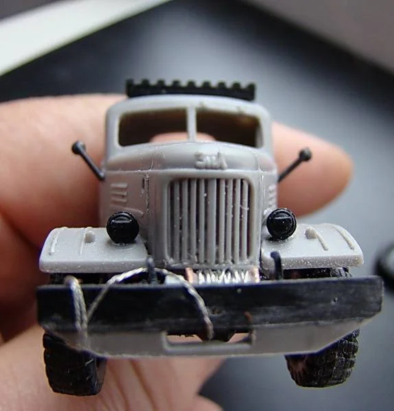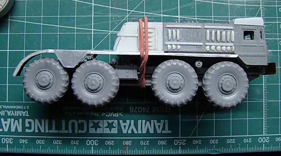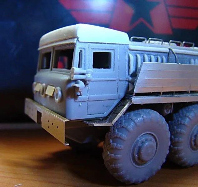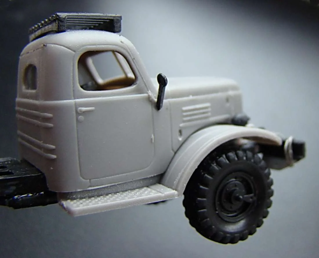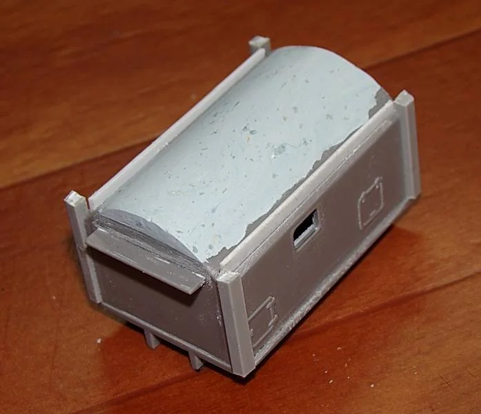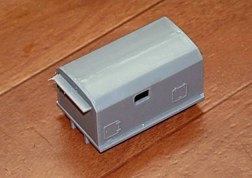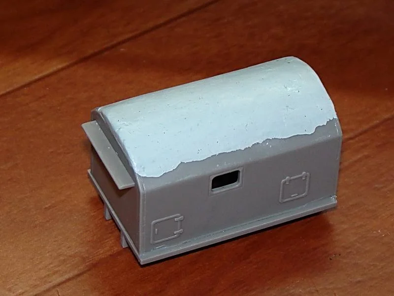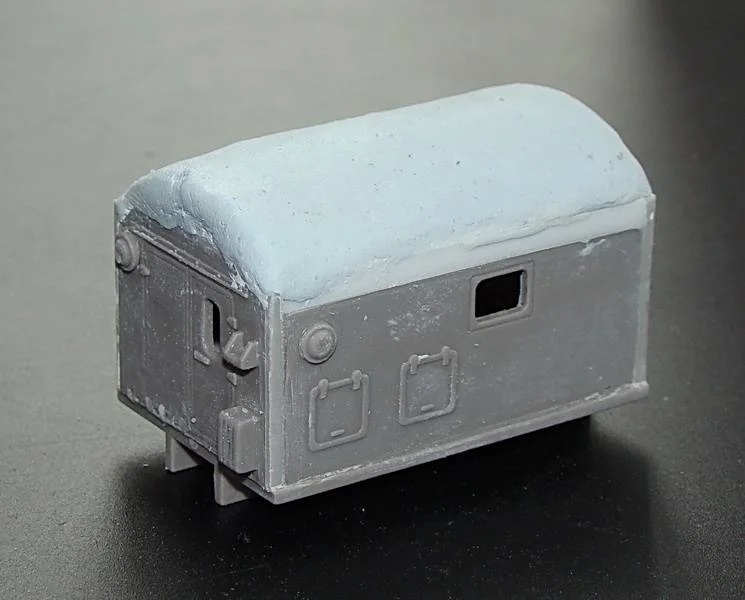 Для изготовления выштамповок воздухозаборной решетки моторного отсека использовал бобышки от полистироловой тары для продуктов.Вырезав бобышку из основания , прошкуриваю ее торец на шкурнике, а затем аккуратно ножом разрезаю ее вдоль осевой линии на две части. Линейные выштамповки на кожухе изготовил из листового полистирола, нарезав тонкие полоски, которые после приклейки немного прошкурил, для придания нужной высоты и конфигурации. А затем вклеил на штатные места выштамповки воздухозаборников. Скобы-поручни изготовил из скобок для степлера и установил на штатные места в предварительно просверленные отверстия, закрепив их клеем.