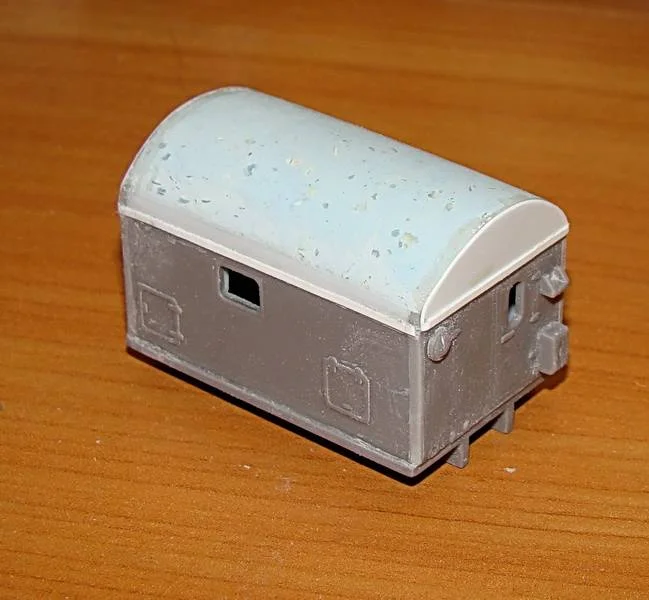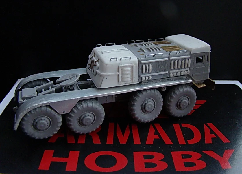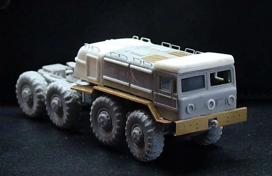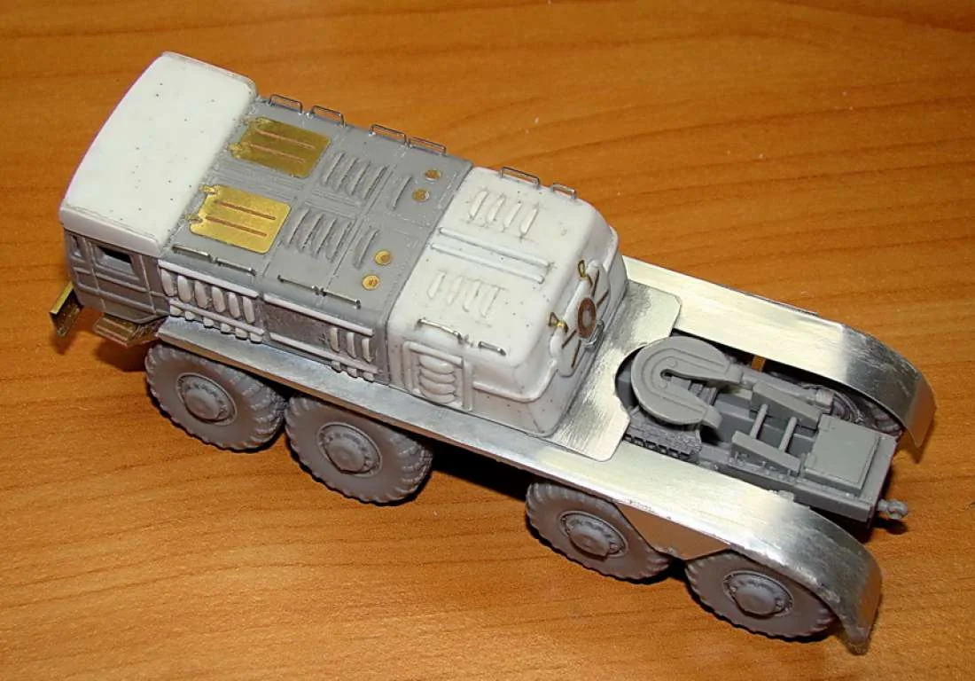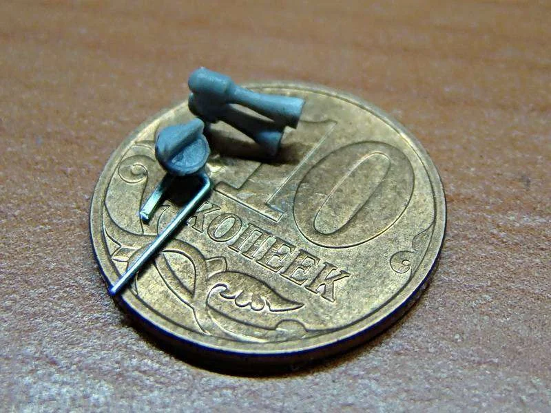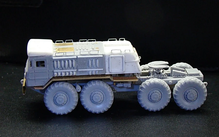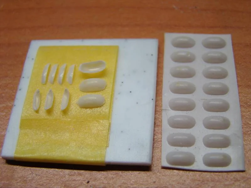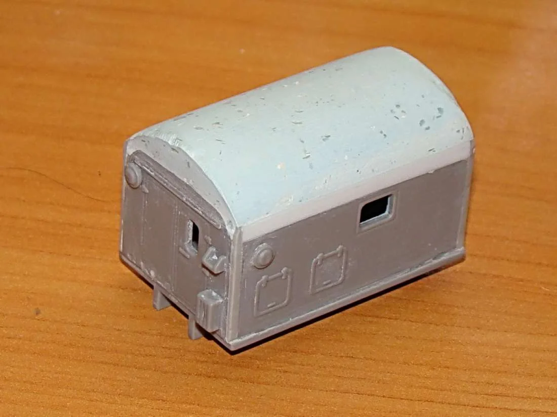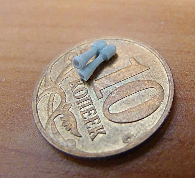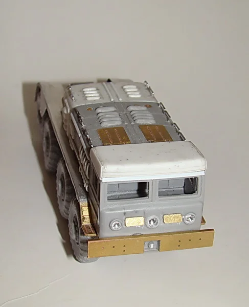 Для изготовления выштамповок воздухозаборной решетки моторного отсека использовал бобышки от полистироловой тары для продуктов.Вырезав бобышку из основания , прошкуриваю ее торец на шкурнике, а затем аккуратно ножом разрезаю ее вдоль осевой линии на две части. Линейные выштамповки на кожухе изготовил из листового полистирола, нарезав тонкие полоски, которые после приклейки немного прошкурил, для придания нужной высоты и конфигурации. А затем вклеил на штатные места выштамповки воздухозаборников. Скобы-поручни изготовил из скобок для степлера и установил на штатные места в предварительно просверленные отверстия, закрепив их клеем.