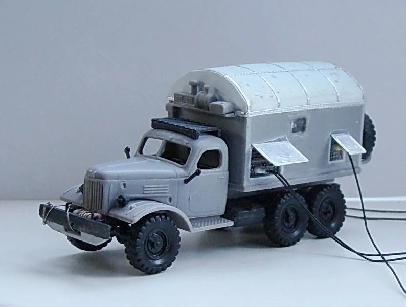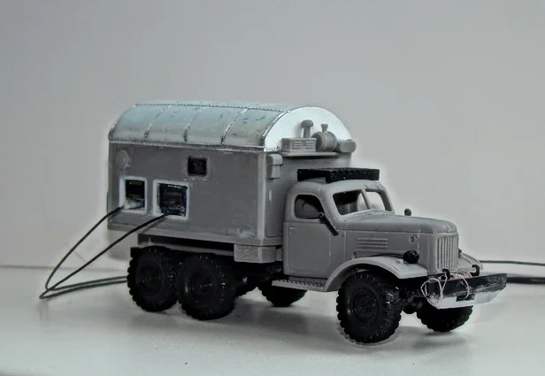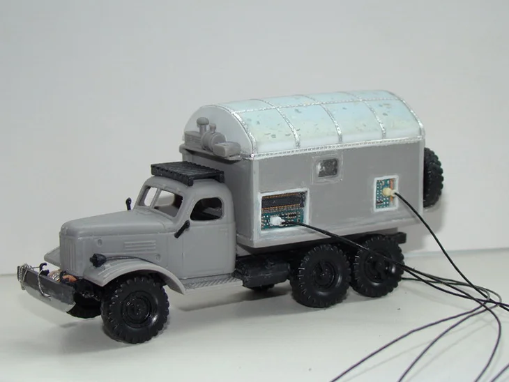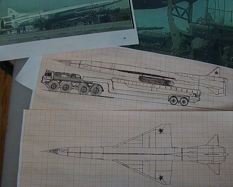 Теперь об общей композиции всей сборки. Сначала было желание исполнить все это в теме "Колонна на марше", но после прочтения монографии узнал, что колонна состояла машин из 50-60 разного типа, а самолет перевозился в разобранном виде - на стартовом полуприцепе ехала хвостовая часть с отстыкованными крыльями и хвостовым оперением, которые тоже ехали на стартовом полуприцепе, закрепленные в спецприспособлениях. Головная часть ехала в спецавтомобиле с терморегулируемым кузовом. Потом все это при помощи кранов и группы обслуживающего персонала собиралось воедино на стартовом полуприцепе, установленном на стартовой площадке, которая представляла из себя круг диаметром 100м, выложенный бетонными плитами. Плиты перевозились на автомобилях и эти авто вместе с кранами входили в состав колонны. Так что мысль о колонне на марше сразу же вылетела из головы, а ее место заняла другая - запечатлеть момент окончания подготовки самолета к старту, когда на старте остаются тягач, стартовое устройство с окончательно скомплектованным самолетом и контрольно- стартовый автомобиль.Но для этого придется немного попилить кунг, открыть крышки на боковых стенках, вклеить в них ящики и начинить их соединительной арматурой и кабелями, тянущимися к самолету. Все это и буду делать .