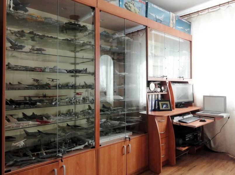 Уходят на полку в шкаф,плавно переходящий в мое рабочее место. Вся работа, кроме покраски аэрографом, происходит здесь или на даче (летом).Шкафы и стол прочертил под себя и по заказу изготовил, сделал себе подарок перед выходом на пенсию. Часть моделей осталась на заводе- украшают стенды с продукцией в кабинетах гл. инженера и директора.