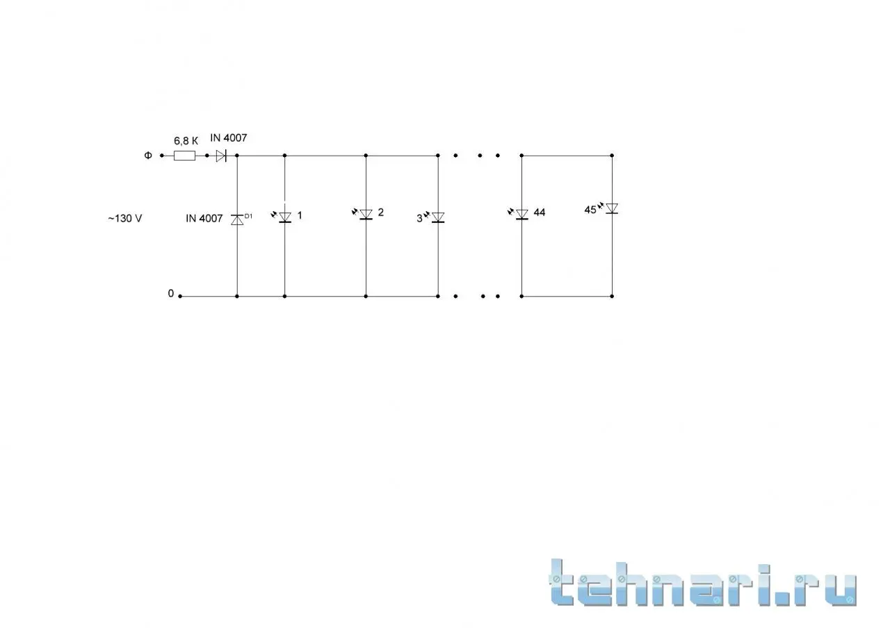 Приветствую ребята. Помогите пожалуйста с подключением китайского светодиодного фонарика. В обшем есть три таких фонарика...название не известно так как не написано были куплены по 300 руб. за штуку. Питаются от 4-х батареек типа АА = 6 вольт. Светят довольно ярко. Подключил через лабораторный блок питания при 6 вольтах потребляет более 2,5 А. Светодиодов в фонарике 45 шт. и подключены все параллельно. Данный момент мне необходимо подключить фонарик к 127-130 вольт переменки чтоб так же ярко горели как от батареек. Вчера при экспериментах с подключением сжег один из фонариков. Помогите пожалуйста правильно рассчитать сопротивление для фонарика и как лучше его подключить... подключал по такой схеме но ничего не вышло...
