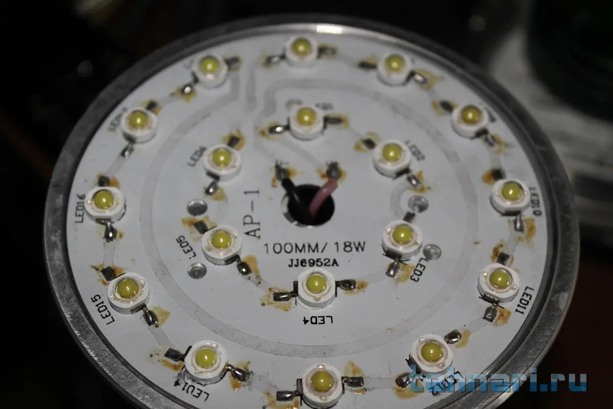 Все они состоят из 18 последовательно включённых SMD светодиодов (фото), сдаётся мне, что каждый по 1 Вт. Все они подключены без токоограничивающего резистора.