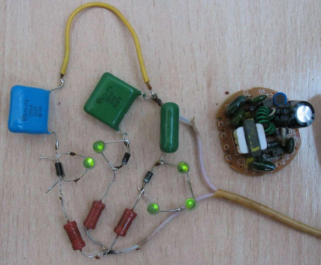 На верхнем фото также присутствует электронный балласт от энергосберегающей лампочки, откуда были добыты диоды 1N4007.