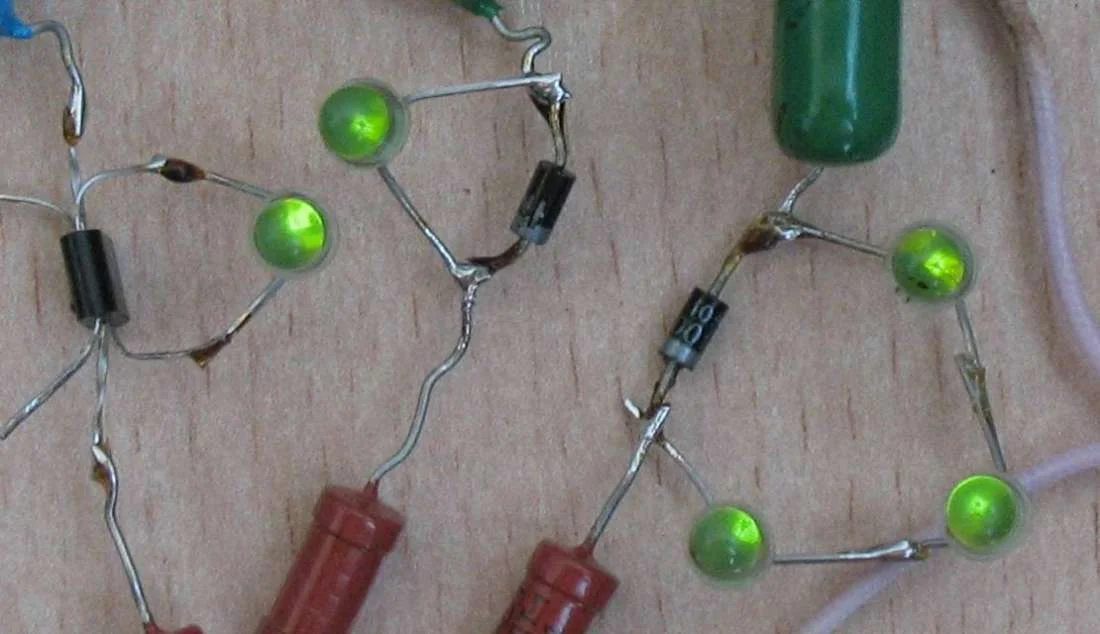 В первой цепочке (на фото слева) один светодиод подключен через диодный мост КЦ407А. Токоограничительный резистор 220 Ом.
