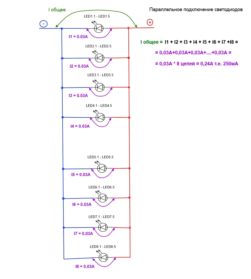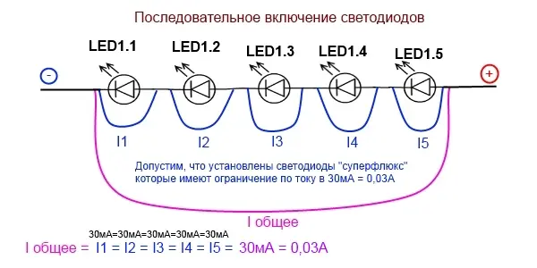 Теперь рассмотрим возможные токи в цепях: - сначала последовательное соединение светодиодов - по расчетам ток там получается на каждую цепь из 5 штук = 0,03А