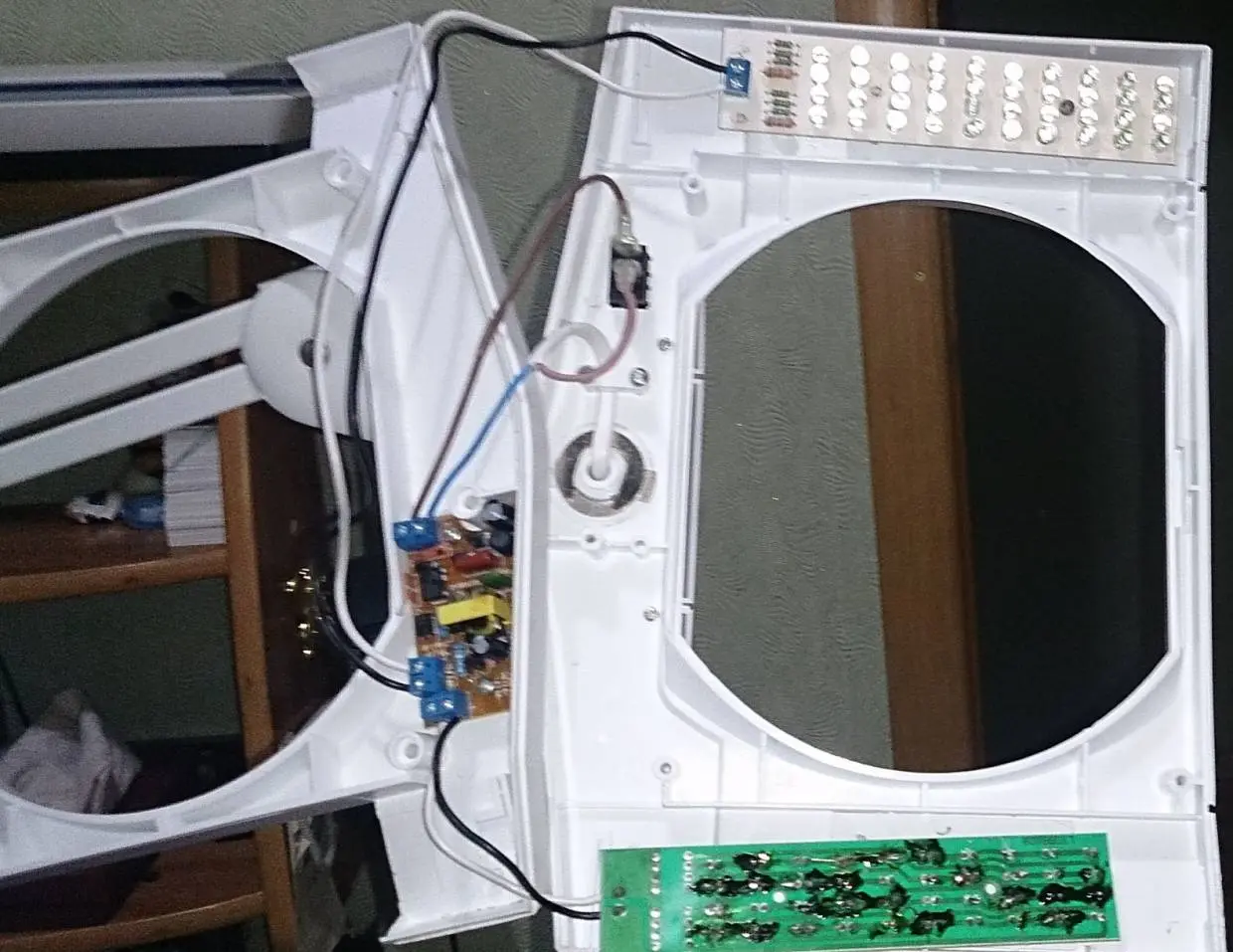 Фото плат с обратной стороны делать стыдно. Я там так "напаял" сослепу, что хоть платы меняй. Да и ничего нового там не увидите. По 8 резисторов, на каждой плате (их видно на фото 1). Каждый из резисторов включен в последовательную цепочку из 5 светодиодов. На каждой плате 8 последовательных цепочек. 17 вольт подается сразу на все, через резисторы.