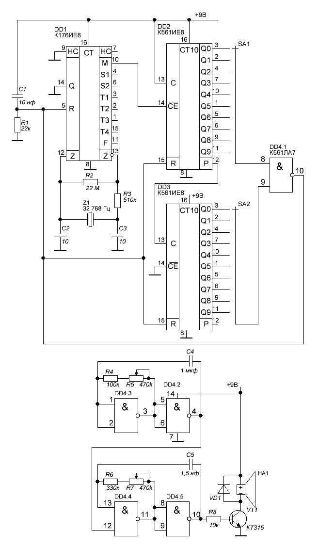 Здравствуйте. Поставил 176ИЕ18. Будет так работать? Добавил схему сброса. И новый звуковой сигнал у меня будет пикать вот так: пип-пип-пип-пип..? Как им управлять с выхода счётчика? Не схема, а каша какая-то :tehnari_ru_942: