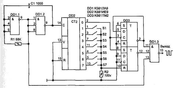 Тут есть недостаток: чуть время ждущего мультивибратора изменилось, или изменилась длительность импульсов генератора, то будет или 4 или 6 импульсов, вместо 5. Вот, схема выдает жестко 5 импульсов, после короткого положительного импульса на вход установки 0. Так же 2 микросхемы . (561ТЛ1 содержит 4 элемента). 561ТЛ1 можно заменить на К561ЛА7, эта замена приведет к большей температурной нестабильности по времени импульсов.