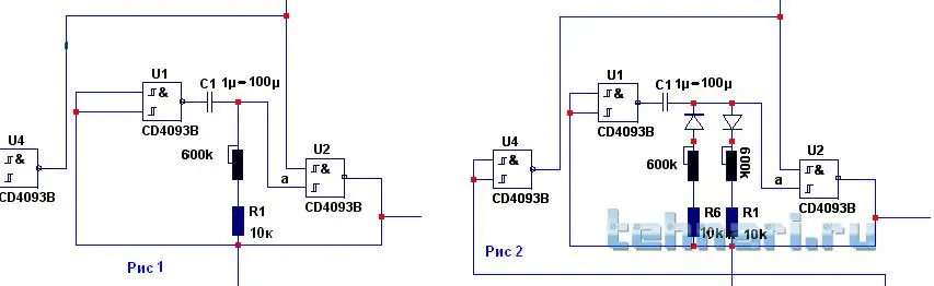 Длительность импульса и паузы для К561ЛЕ5 примерно равн: T=0.5*R*C. Для К561ТЛ1 время получается больше, за счет гистерезиса больше размах заряда.