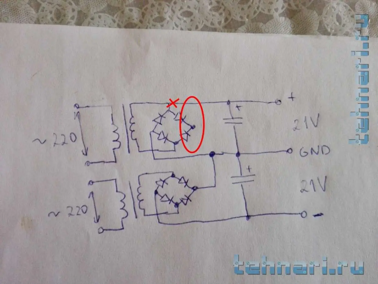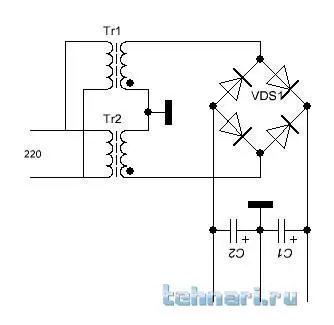 Это какой то очень интересный принцип. Я бы, честно скажу, до такого принципа не дотумкал бы! Ну, да, два транса. Обычное дело. Соединяем два средних вывода вместе, и получаем выходную обмотку со средней точкой. Всё. А дальше как обычно : диодный мост и два кондея. А ты как то очень мудрённо всё соединил. Плюс ко всему верхний диодный мост в воздухе висит.