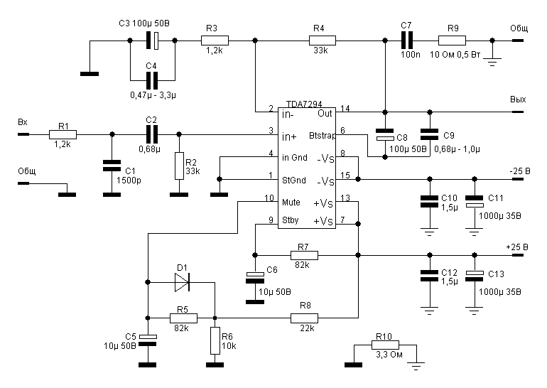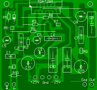 собрал я усилитель на Tda7294 ( фото схемы и платы ниже). Столкнулся при подключении с проблемой. На выходе постоянное напряжение (18-20 В). Питание 2х20В . Ток холостова хода получился 100мА, коротковременно подключая динамик 1А. Замыканий нет. Собрал 2 одинаковых усилителя и у обойх та жк проблема. Что может быть? Как исправить? Сомневаюсь что микросхема палённая (ну не обе же?)