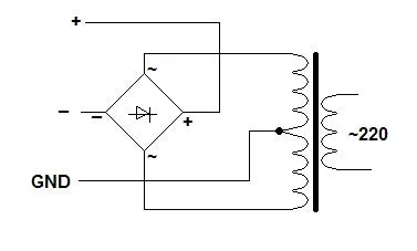 в общем так: общий питания - это начало одной обмотки и конец другой.получается,на общий идут 2 провода от трансформатора напрямую.другие 2 провода идут на диодный мост, а от него на + и - соответственно. что не понятно - пишите.