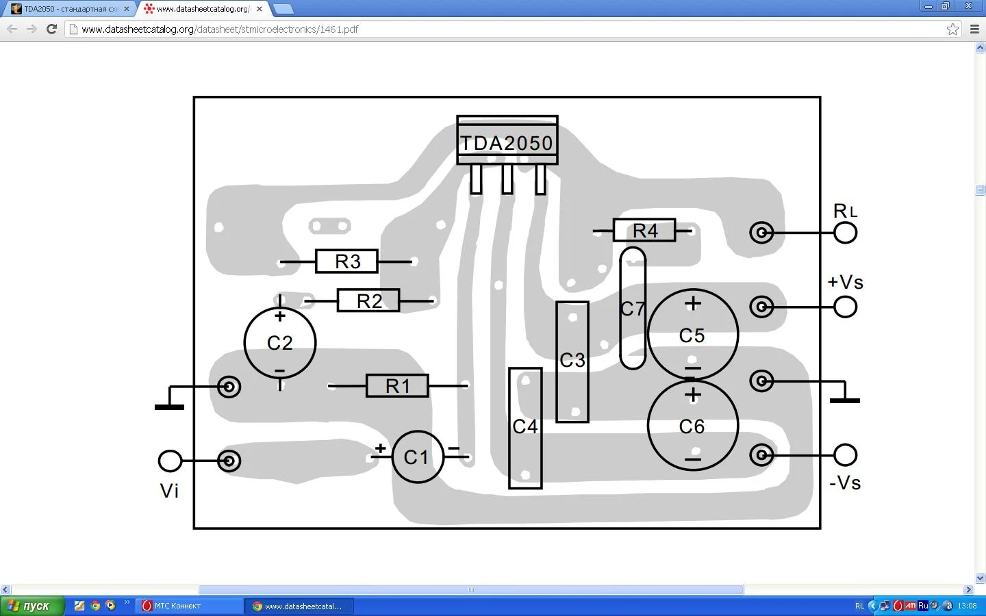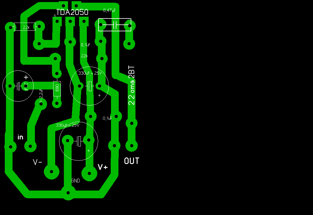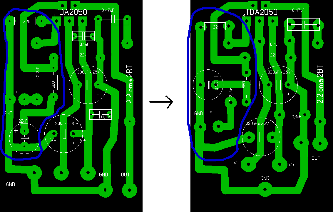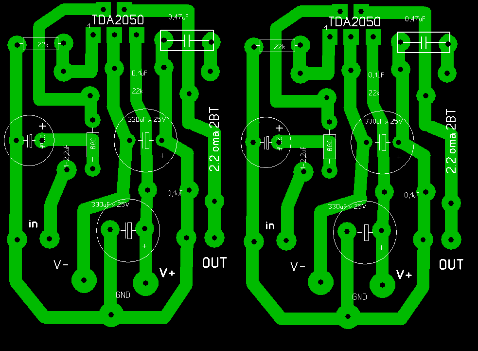 Я вот не пойму, если собирать стандартную схему, то почему не воспользоваться даташитовской печаткой? Там хотя бы параметры усилителя гарантированы. А из этого самопала еще не известно что получится, но лучше точно не будет.