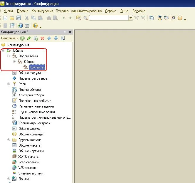 Для начала необходимо создать подсистему «Общее», а затем подчиненную подсистему «Контакты». В типовой конфигурации просто создайте подчиненную подсистему «Контакты». Делается это в ветке «Конфигурация/Общие/Подсистемы».