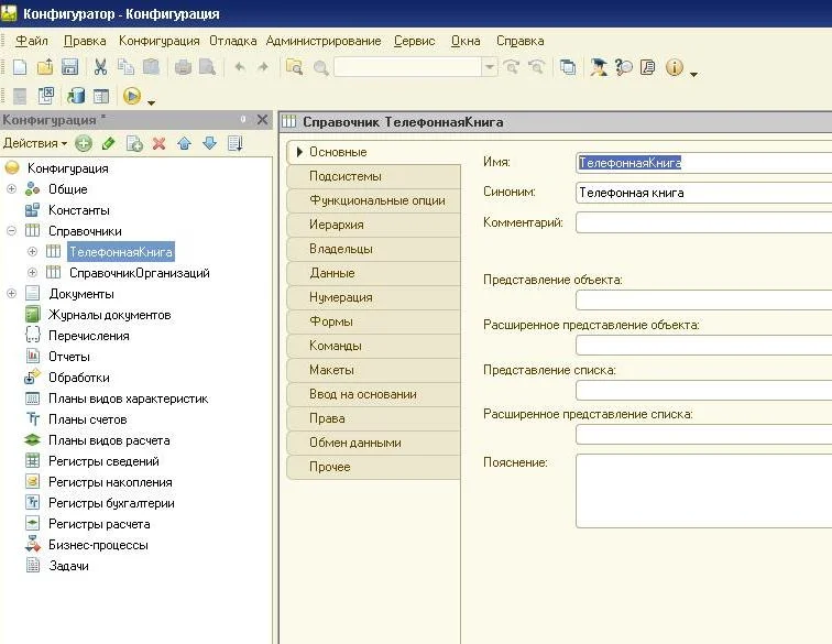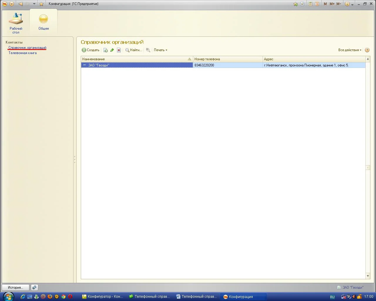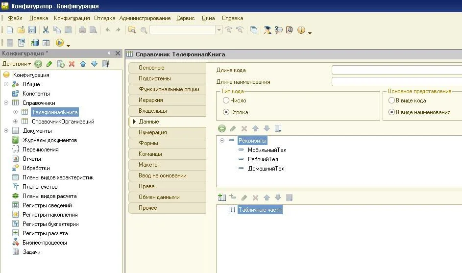 Все, телефонный справочник к Вашим услугам. Как видите, ничего сложного. При необходимости можно добавить и другие реквизиты, такие как «веб-страница», «e-mail», «адрес» и т.п., кому как удобно. Я создал еще один справочник «Справочник организаций». Из реквизитов добавил только «Наименование», «Номер телефона» и «Адрес».