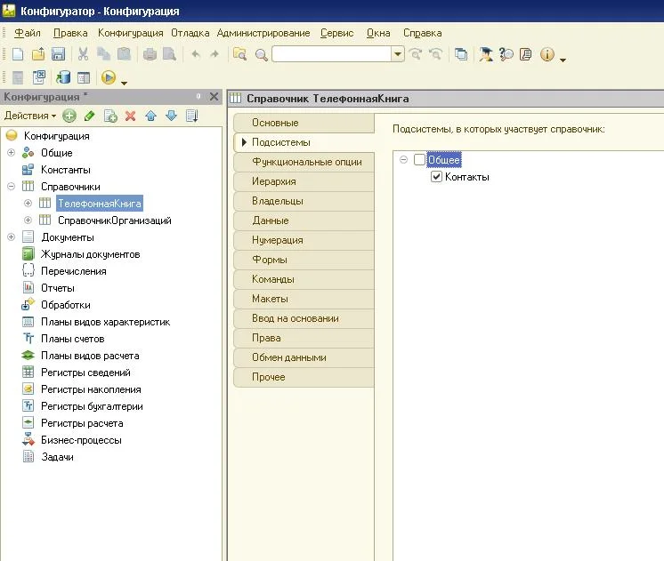 Далее переходим к созданию самого телефонного справочника. Идем на ветку «Справочники» жмем ПКМ/Добавить. Называем справочник «Телефонная книга» и включаем его в подсистему «Общие/Контакты».