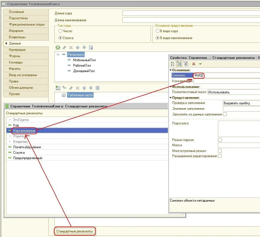 Там же, воспользовавшись кнопкой «Стандартные реквизиты», переопределим синоним реквизита «Наименование» на «ФИО».