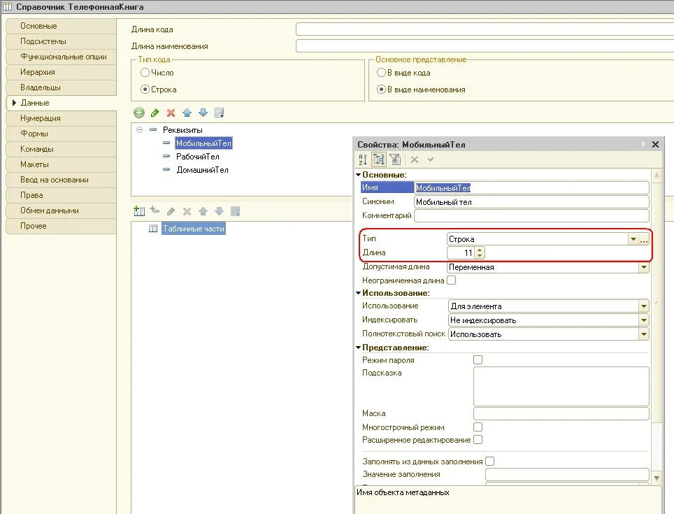 В свойствах каждого реквизита, в поле «Тип» указываем «Строка», а «Длину» делаем 11 символов.