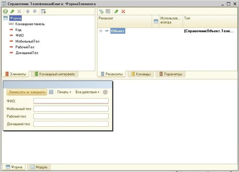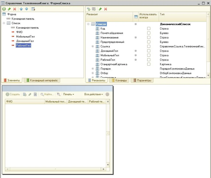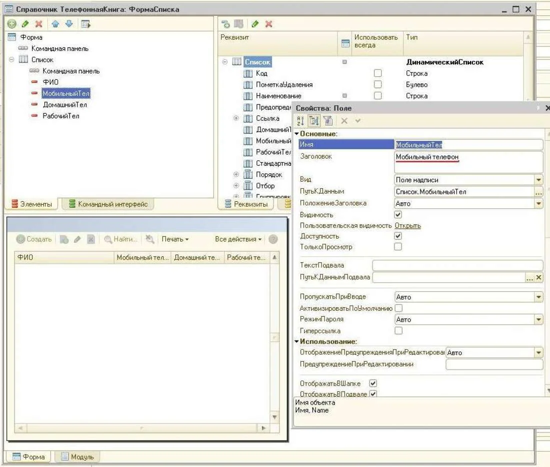 Теперь необходимо создать «ФормуСписка». Здесь также переименовываем поле «Наименование» в «ФИО» (если потребуется), потом перетаскиваем из списка (справа) реквизиты : МобильныйТел, РабочийТел, ДомашнийТел.