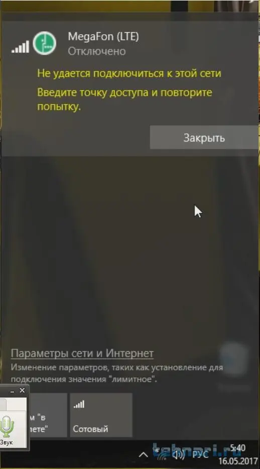 В Windows 1607? подключался к интернету(мегафон модем) через значёк на панели задач. Установил 1703, появилась проблемма с подключением, просит ввести точку доступа. Как настроить данную опцию?