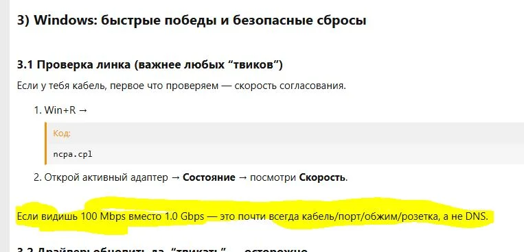 - Windows: проверка скорости линка (100 Mbps vs 1 Gbps) — важнее любых “твиков”;