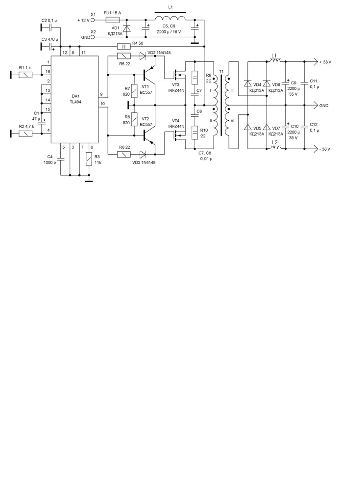 Ну что я могу сказать Юрий -БРАВО. Опять победа интеллекта над машиной. После перемотки все заработало как надо. Только питание получилось аж +-38В (наверно надо во вторичке по 6 витков делать). А так все работает.