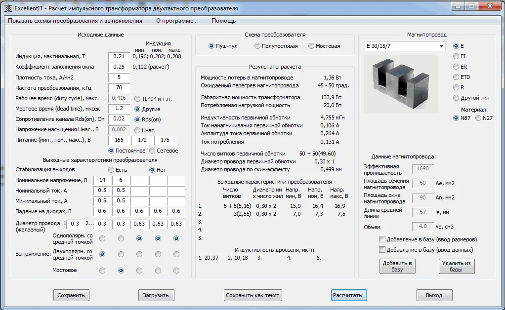 Если точнее, то действующее на первичке 155В, половина от 310, полученное после выпрямителя. С небольшой оговоркой, если сеть не кривая и есть 220-230В. Ставить галку на "сетевое". Прога сама "знает" , сколько считать на первичке полумостаПочему сетевое? Напряжение на транс 170в. Или тестер правильно не покажет?