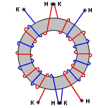 Ну тогда обмотки мотаются вот так, чтобы была симметрия, у второй обмотки