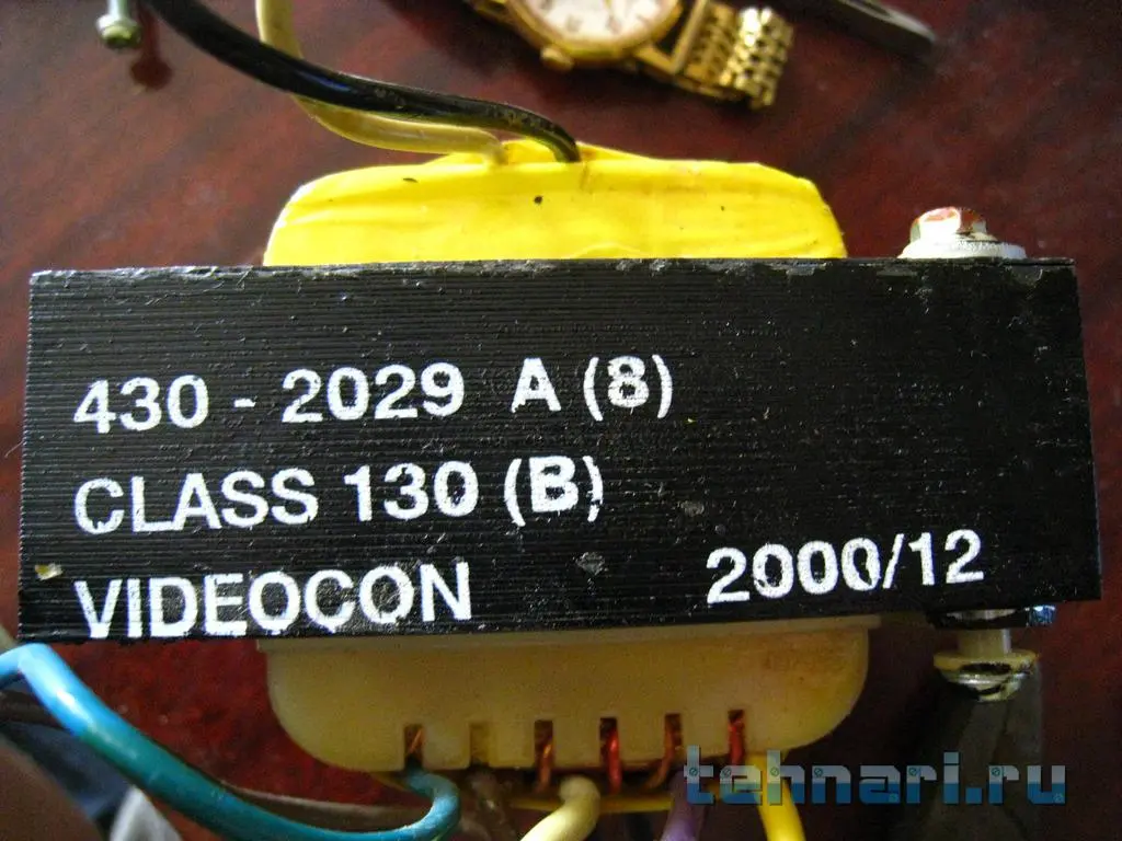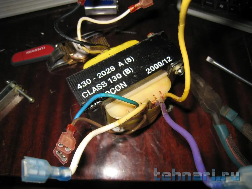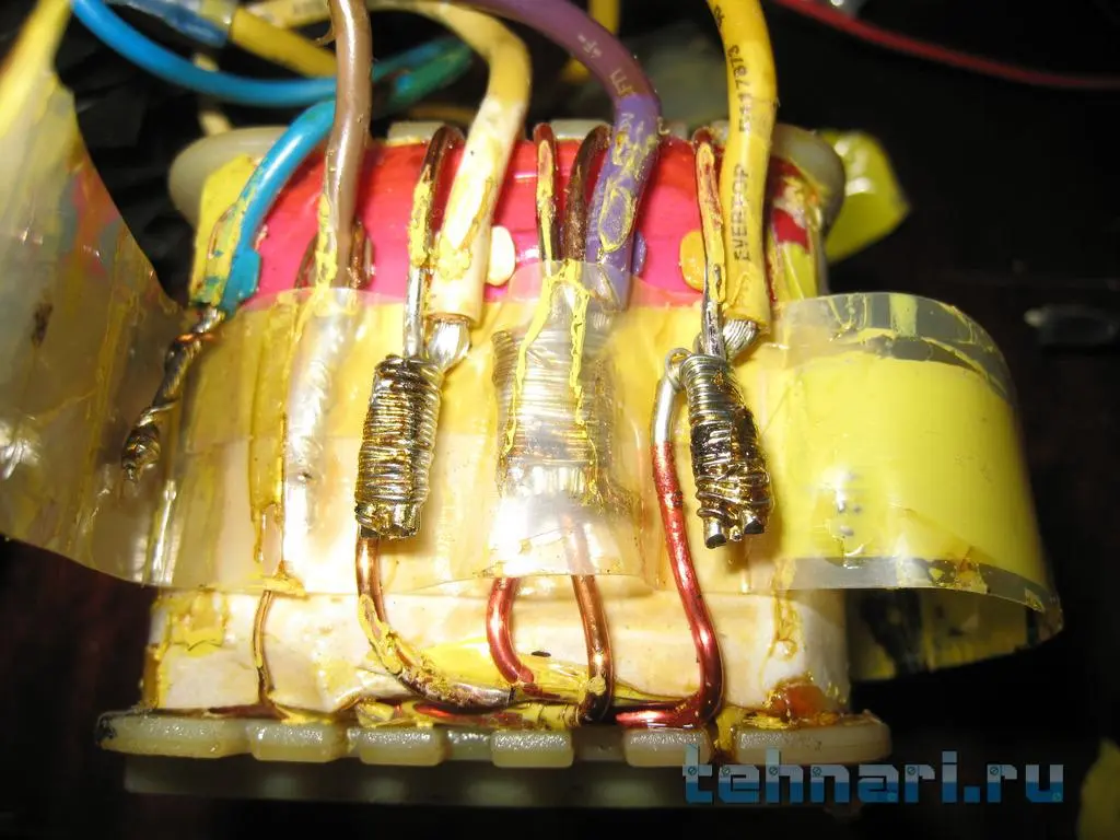 как оказалось у транса обрыв обмотки (имея какой никакой опыт дружбы с паяльником сделал вывод что это первичка, т.к. 2 вывода находятся отдельно (с другой стороны транса) от остальных) разобрал я это дело, стал курочить катушку, и тут несколько удивился... Судя по тому что я обнаружил при вскрытии, у транса закольцованы 2 обмотки (они же имеют самые толстые провода)